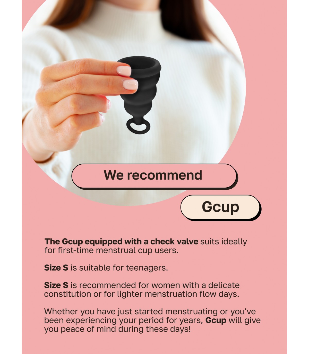 Der Hauptvorteil und die Innovation des Gcup ist die interne Struktur. Im Inneren des Behälters befindet sich ein Rückschlagventil, das das Austreten der Flüssigkeit verhindert. Die Gcup Menstruationstasse ist glockenförmig und daher einfach zu bedienen.