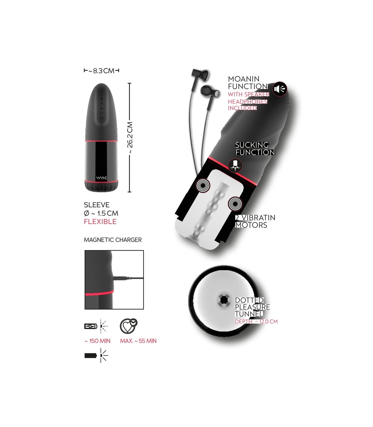 WYNE 02 4-Motoren-Masturbator, der den Penis mit 10 Vibrationsmodi und 3 Saugmodi intensiv verwöhnt. Plus sexy Stöhnen (3 Sounds) über die angeschlossenen Kopfhörer werden Sie in Stimmung bringen. Alle Funktionen lassen sich einzeln oder in Kombination per Knopfdruck direkt am handlichen Spielzeug steuern.
