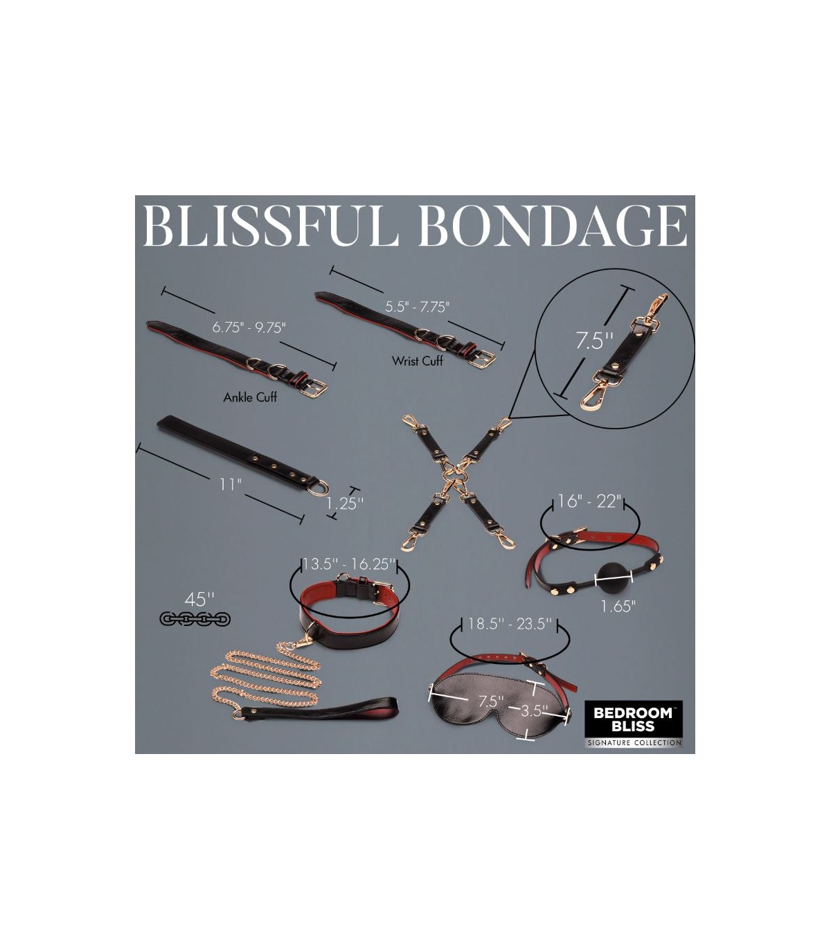 Eigenschaften: Veganes Kunstleder, Premium-Silikon-Ballknebel, festes und dennoch flexibles Schlagbrett, verstellbare Augenbinde, Ballknebel, Kragen, Hand- und Fußfesseln, nickelfrei