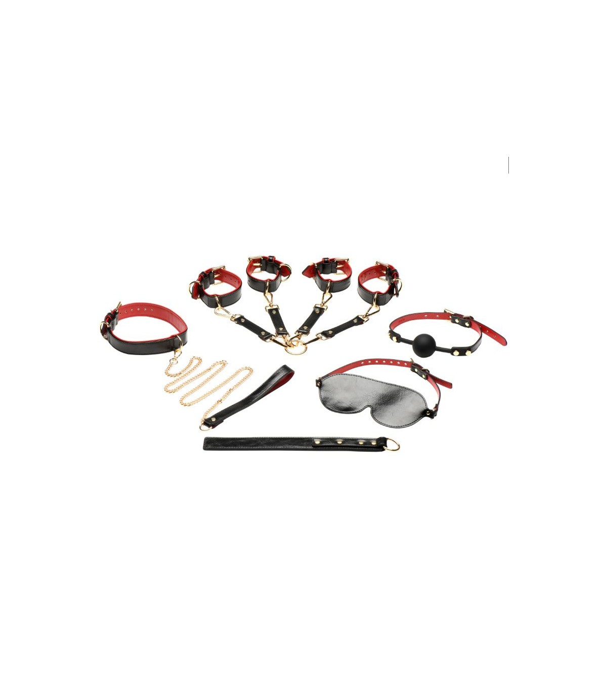 Peppen Sie die Dinge mit dem Lover's Deluxe-Bondage-Set auf! In diesem Set befinden sich ein Ballknebel, eine Augenbinde, ein Halsband, eine Leine, Hand- und Fußfesseln, eine flexible Peitsche und Hogtie-Anschlüsse. Das vegane Leder ist schwarz und rot und hat einen eleganten Look, der durch goldene Schnallen betont wird. Genießen Sie die flexible Peitsche, die stabilen Hand- und Fußfesseln und den verstellbaren Kragen. Befestigen Sie die goldene Kette mit schwarzem Griff an der Halskette und gehen Sie mit Ihrem Liebhaber spazieren oder kontrollieren Sie ihn im Schlafzimmer! Sie können es sogar mit einem Schlafzimmer-Rückhaltesystem kombinieren, ganz wie Sie möchten! Genießen Sie es, das Stöhnen Ihres Liebhabers mit dem bequemen, verstellbaren, phthalatfreien Ballknebel aus Silikon zu dämpfen! Dann gib ihnen ein paar Schläge und genieße den Spaß!