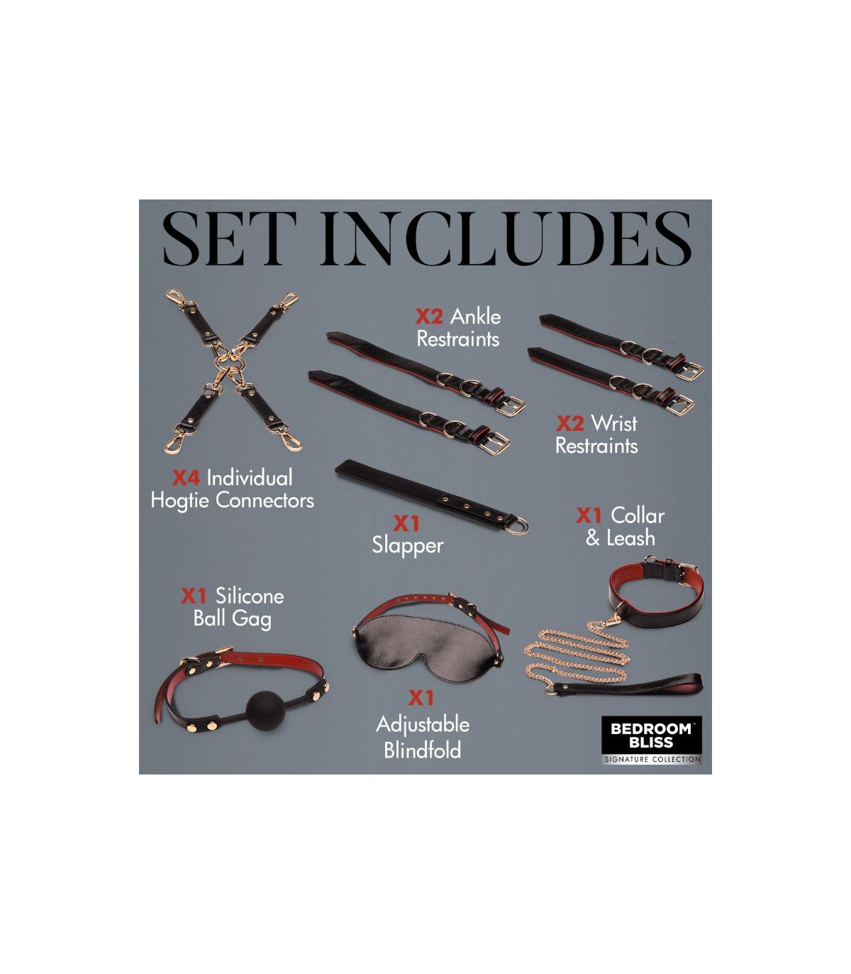 - Komplettes Set voller Spaß!: Alles, was Sie brauchen, einschließlich Ballknebel, Augenbinde, Halsband, Leine, Hand- und Fußfesseln, flexible Peitsche und Hogtie-Anschlüsse.
