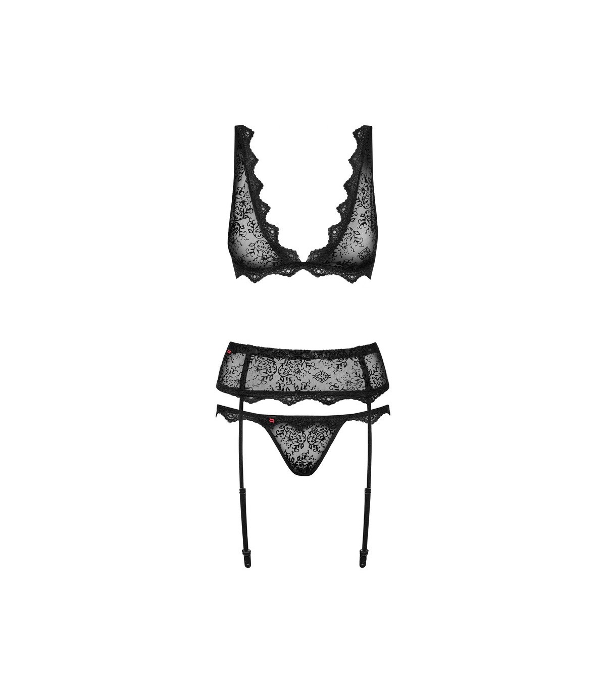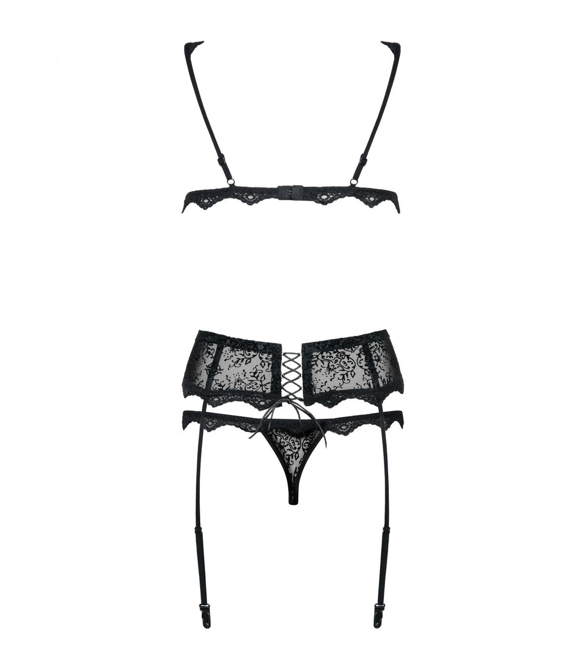 Dreiteiliges Spitzenset: BH, Tanga und Strumpfgürtel. Durchscheinendes Material, verziert mit Samt- und Spitzenmotiv. Verstellbare Träger und Hakenregulierung in 3 Stufen. Sie garantieren eine gute Passform. Strapsgürtel mit Bügeln, verstellbaren Trägern und Korsettbesatz. Garantiert Komfort und Passform! Angenehmes und elastisches Material (90 % Polyamid, 10 % Elasthan)