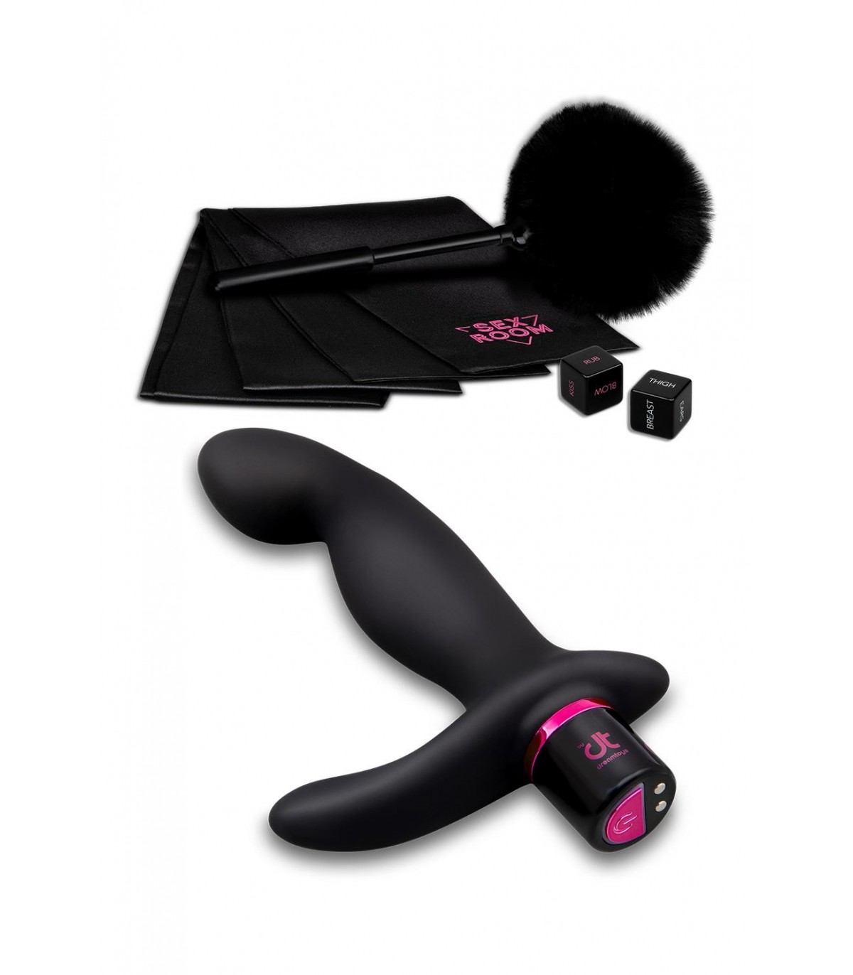 Schaffen Sie mit dem Sex Room Prostate Play Kit einen erotischen Spielplatz mit kraftvoller Vibration für eine innere Massage. Ebenfalls enthalten sind ein Paar Würfel, ein Federspielzeug und eine Satin-Augenbinde, um die richtige Umgebung für sensorisches Spielen zu schaffen.