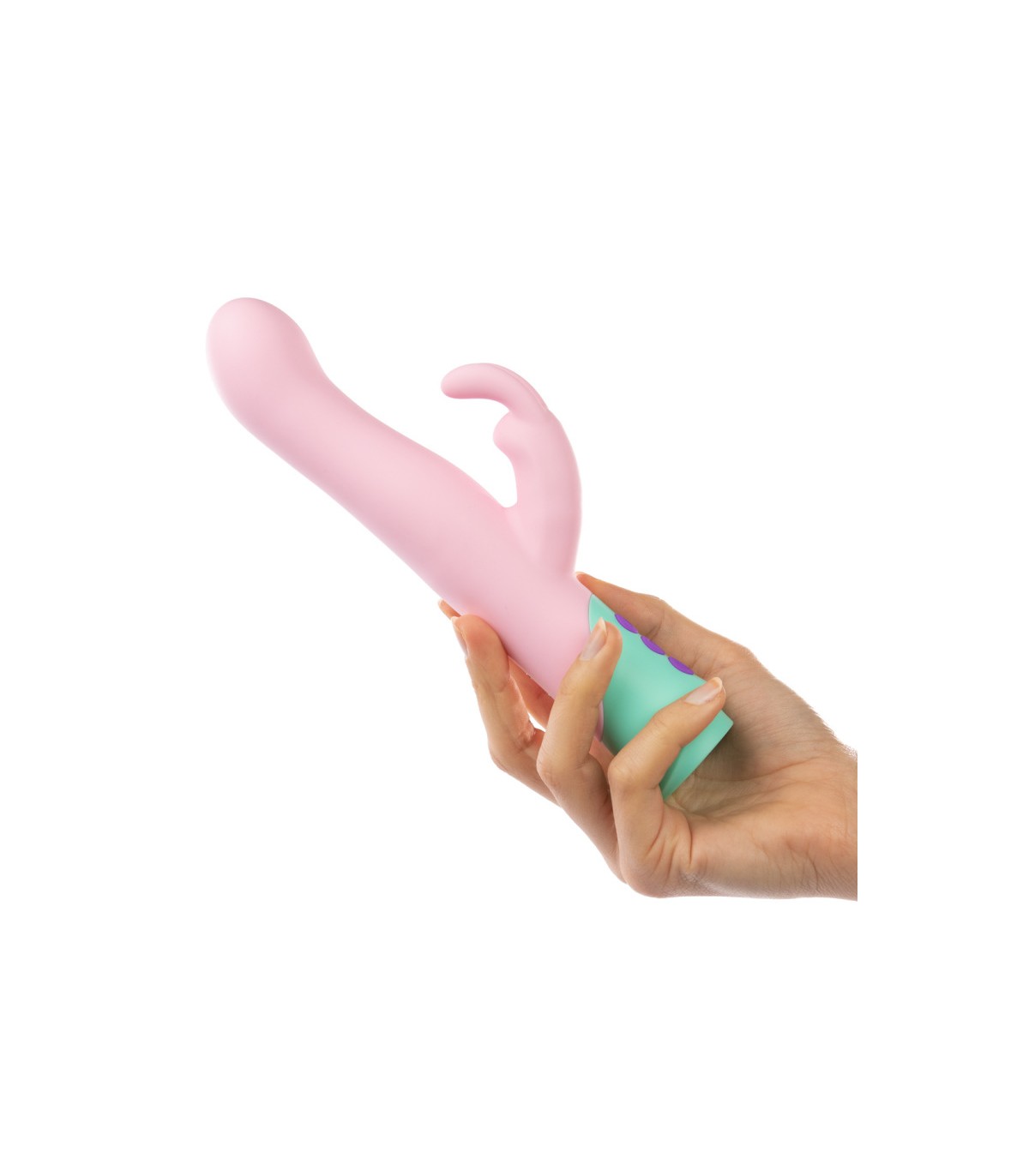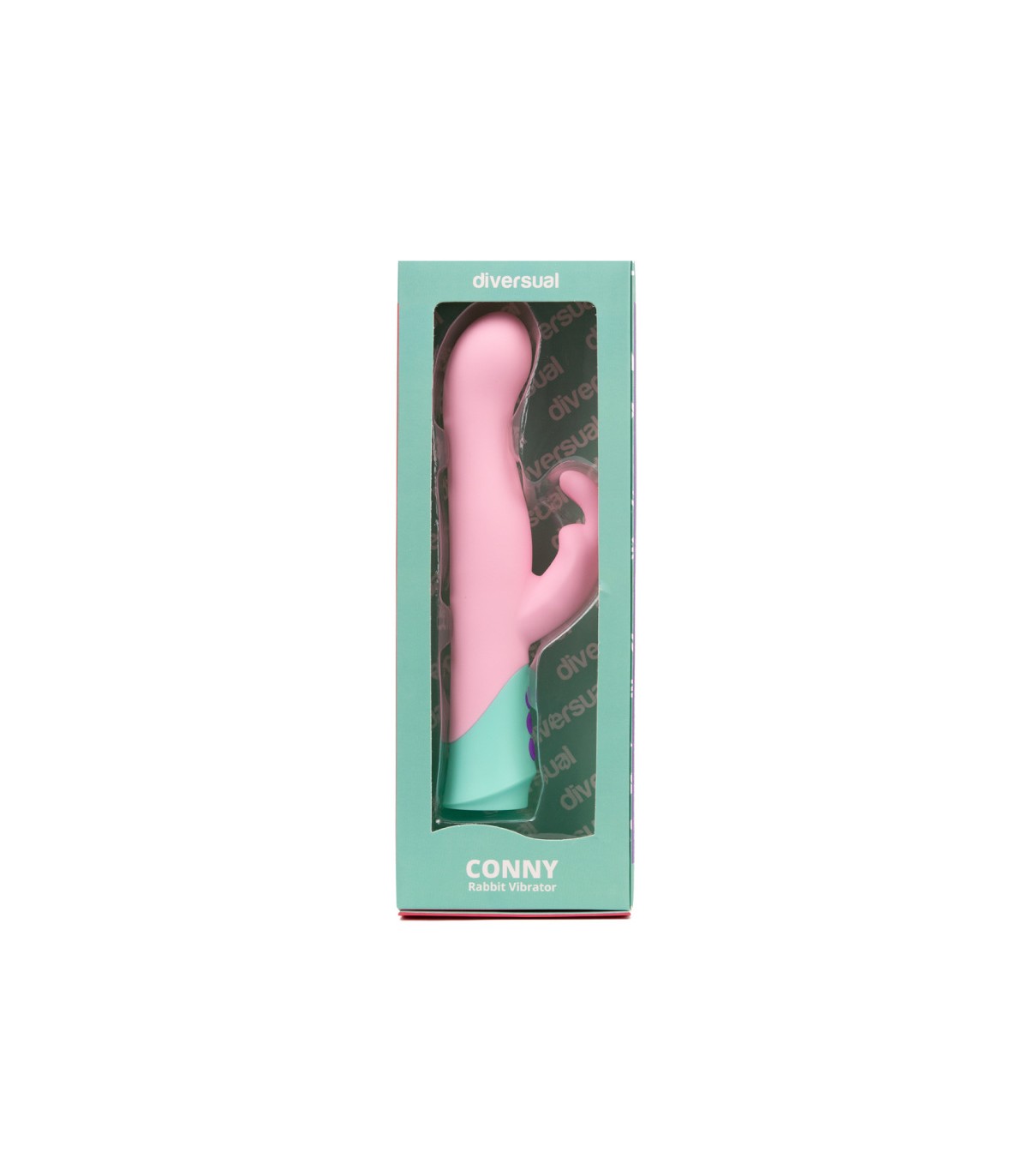 Der Bunny-Vibrator zur Stimulation der Klitoris und des G-Punkts Conny Rose hat ein ergonomisches Design mit abgerundeten Linien, das sich dank seiner Flexibilität an verschiedene Anatomietypen anpasst.