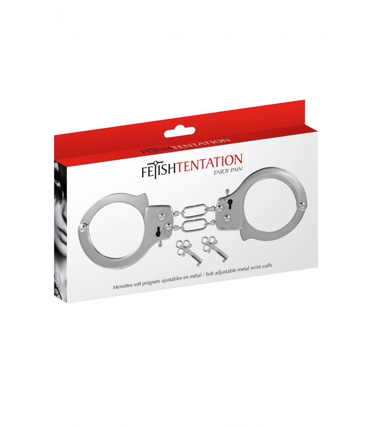 Handschellen aus Metall mit einem verstellbaren Durchmesser von 5'50 cm bis 6 cm.