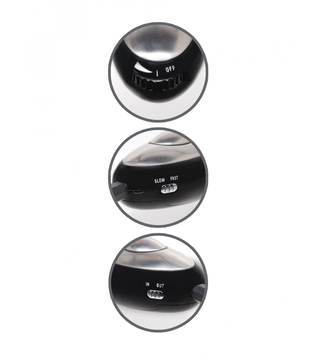 Um die Steuerung als Handmassagegerät zu verwenden, wechseln Sie in den „IN“-Modus. Das ovale Mittelstück gibt den Schock ab, wenn Ihre Handfläche einen anderen Teil des Metalls berührt. Um das Netzteil mit den Klemmen zu verwenden, wechseln Sie in den „OUT“-Modus und schließen Sie den Klemmen-Eingangsstecker an.