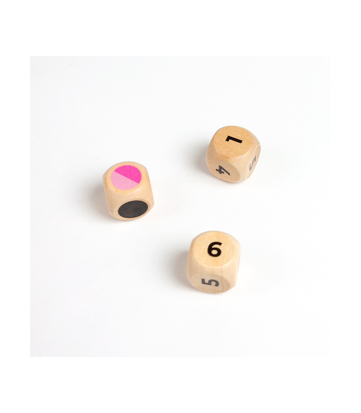 Sie können mit dem farbigen Würfel und den zwei Zahlenwürfeln spielen, indem Sie zuerst den farbigen Würfel und dann den zwei Zahlenwürfel werfen, um zu sehen, welche Farbe und Zahl das Teil hat, das Sie entfernen müssen.