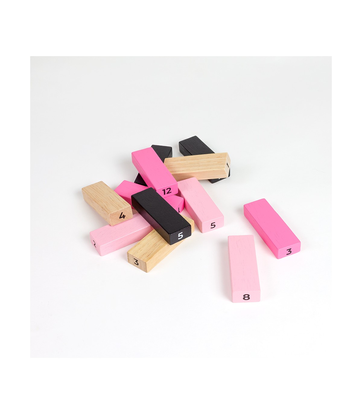 Die Teile sind in den vier Farben Holz, Rosa, Fuchsia und Schwarz von 1 bis 12 nummeriert.