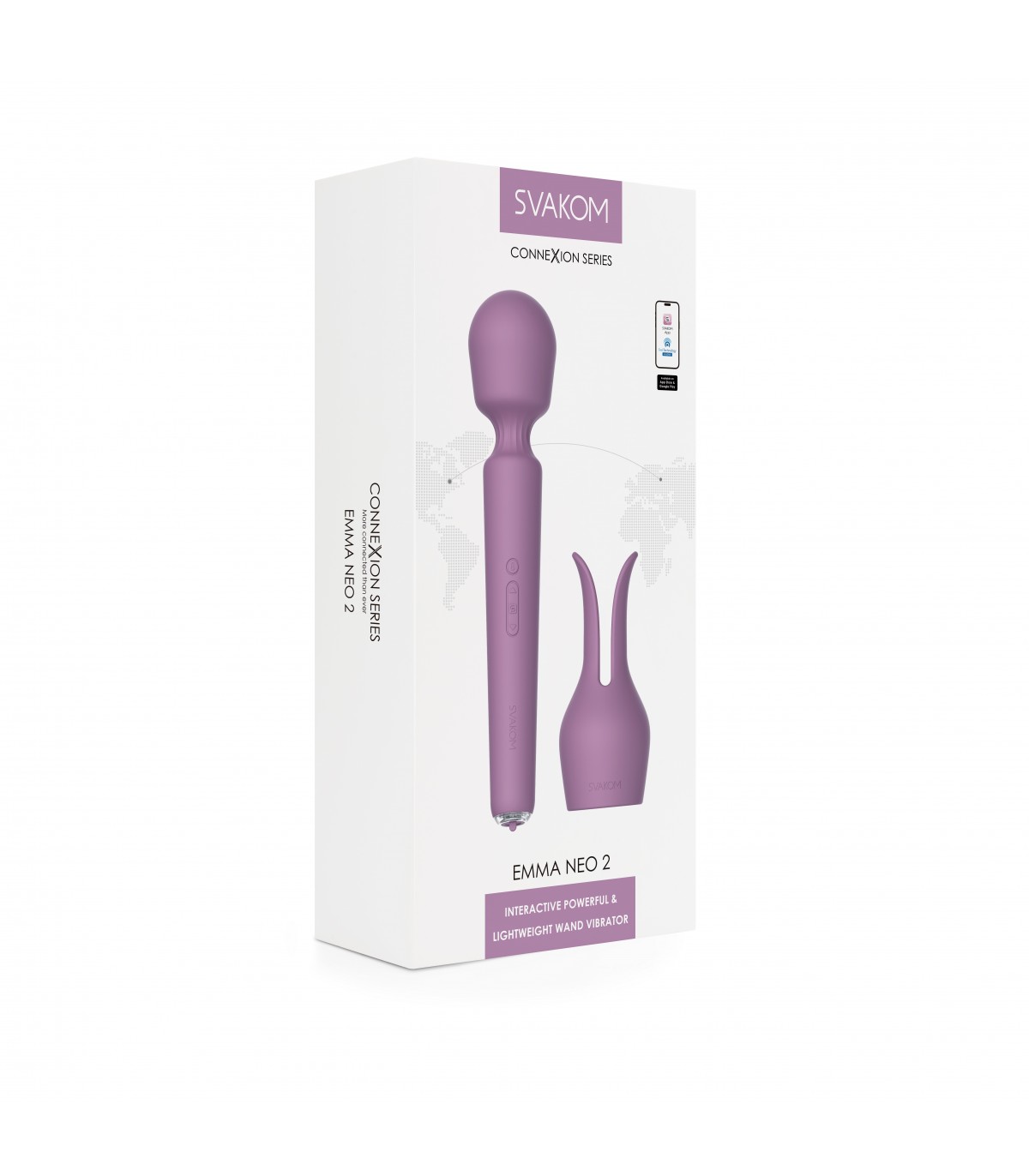 Emma Neo 2 bietet kraftvolle, leise Vibrationen, die nicht auf den Griff übertragen werden, und ein ultraleichtes, körpersicheres Design. Die farbigen Lichter zeigen die optionale Temperatur von 38°C an. Für weitere Optionen verwenden Sie Emma Neo 2 mit der SVAKOM-App oder mit kompatiblen Videos oder Webcam-Sites für Erwachsene. Zusätzliche Funktionen: Hasenohren-Zubehör, USB-Aufladung, Batterieleuchten und Reisesicherung.