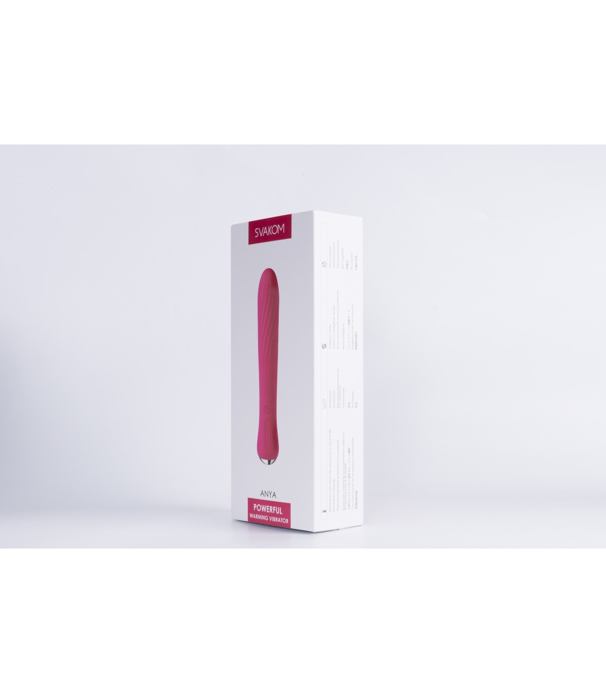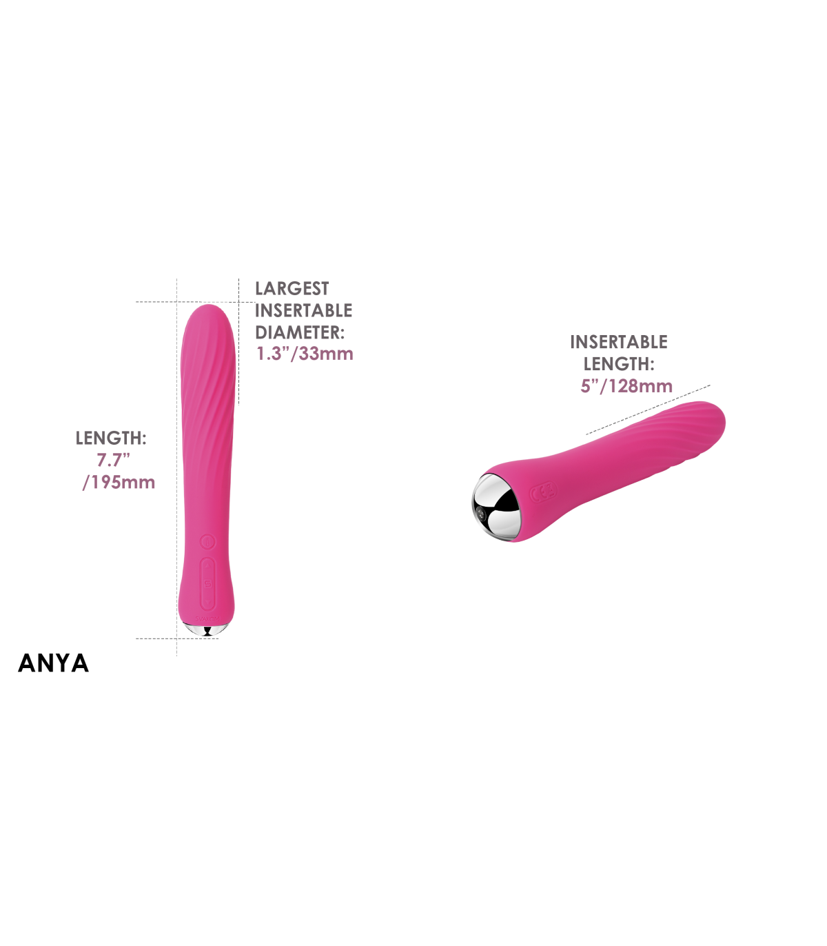 Anya ist ein leistungsstarker Vibrator mit Wärmefunktion. Durch seine mittlere Größe liegt es angenehm in der Hand und ist sehr einfach zu bedienen. Es wärmt knapp über die Körpertemperatur, bis zu etwa 38 °C (100,4 °F), und gewährleistet so das Eindringen der Körperwärme auch in der Kälte des Winters. Anya ist spritzwassergeschützt nach Stufe 6. Die Wasserdichtigkeitsklasse 6 bedeutet, dass Anya vor starkem Strahlwasser geschützt ist.