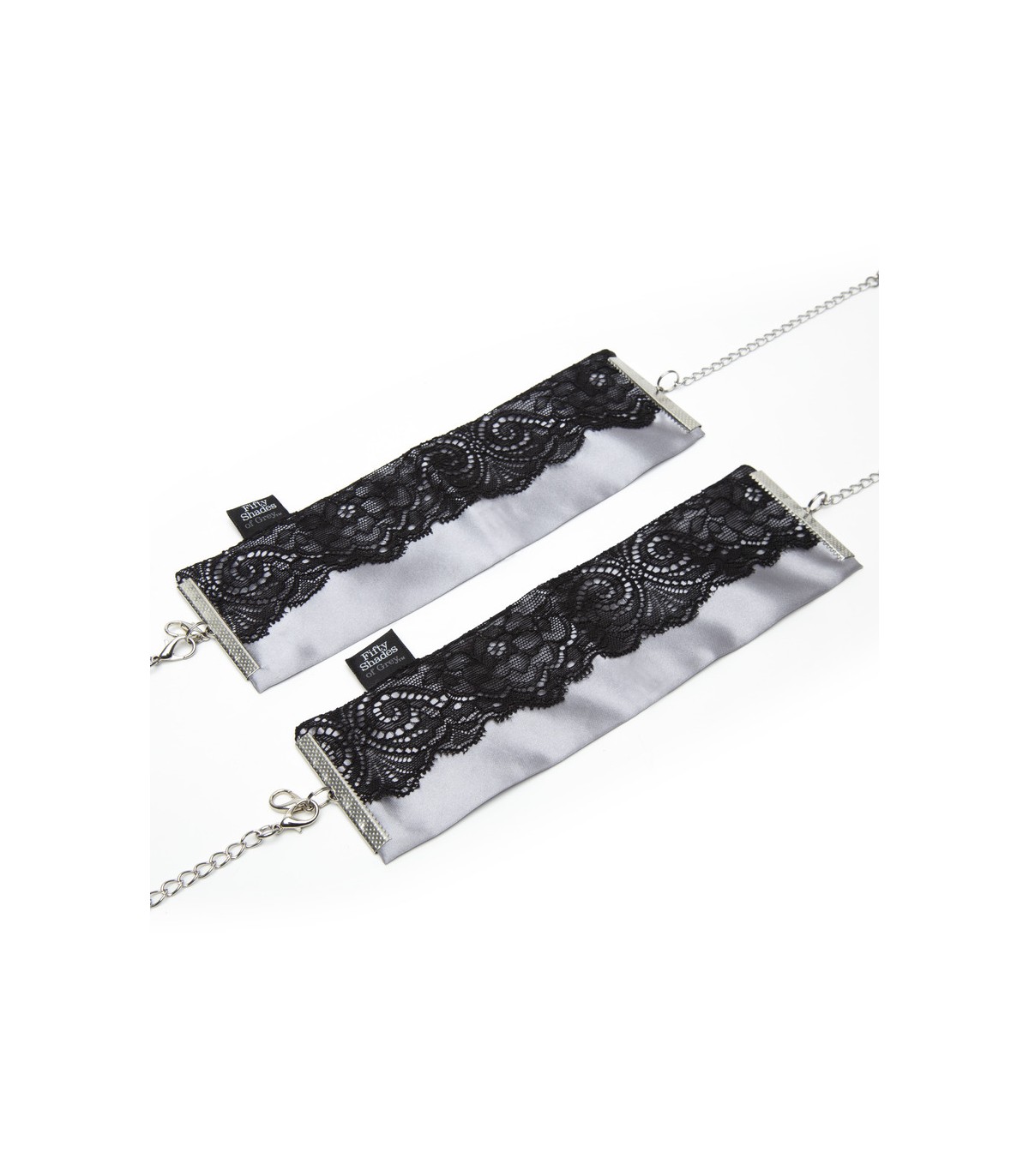 Halten Sie Ihren Geliebten genau dort, wo und wie Sie möchten, mit diesen stilvollen Fesseln, die von der Fifty Shades-Trilogie inspiriert sind. Einige Handschellen für Handgelenke aus weichem Satin und zarter schwarzer Spitze, die Ihre fetischste Seite mit Eleganz zeigen.