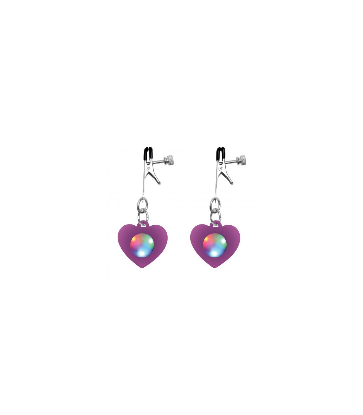 Zeigen Sie ihnen das Licht Ihres Herzens mit diesen leuchtenden Herz-Nippelklemmen! Wählen Sie aus 3 verschiedenen Lichtmustern und geben Sie ihnen eine Show, die sie nicht vergessen werden! Das violette Herz und die grünen, blauen und roten LED-Lichter werden sie mit Sicherheit blenden!