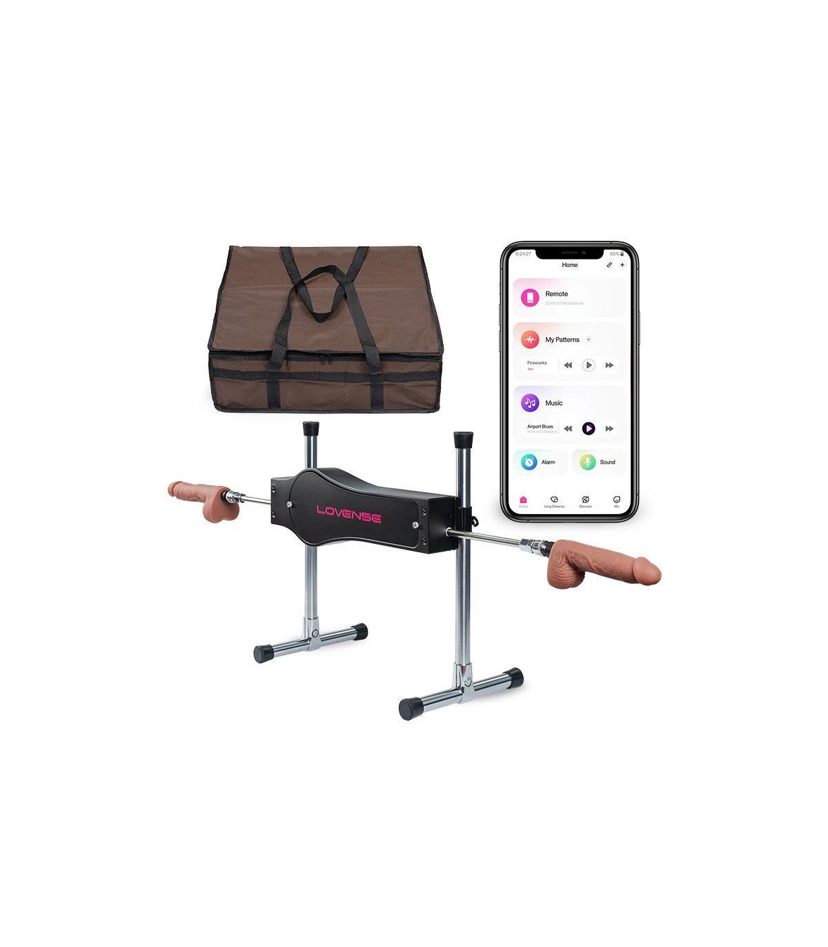 Sexmaschine mit einem leistungsstarken Antriebsmotor mit zwei Ersatzpenis, die über die APP der Marke LOVENSE gesteuert werden.