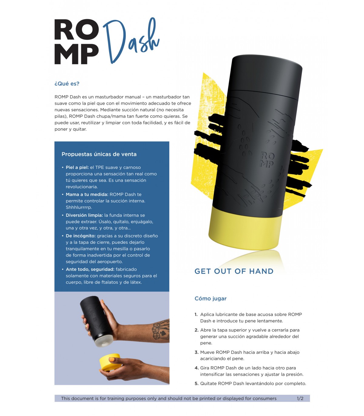 ROMP Dash es un masturbador manual – un masturbador tan suave como la piel que con el movimiento adecuado te ofrece nuevas sensaciones. Mediante succión natural (no necesita pilas), ROMP Dash chupa/mama tan fuerte como quieras. Se puede usar, reutilizar y limpiar con toda facilidad, y es fácil de poner y quitar.