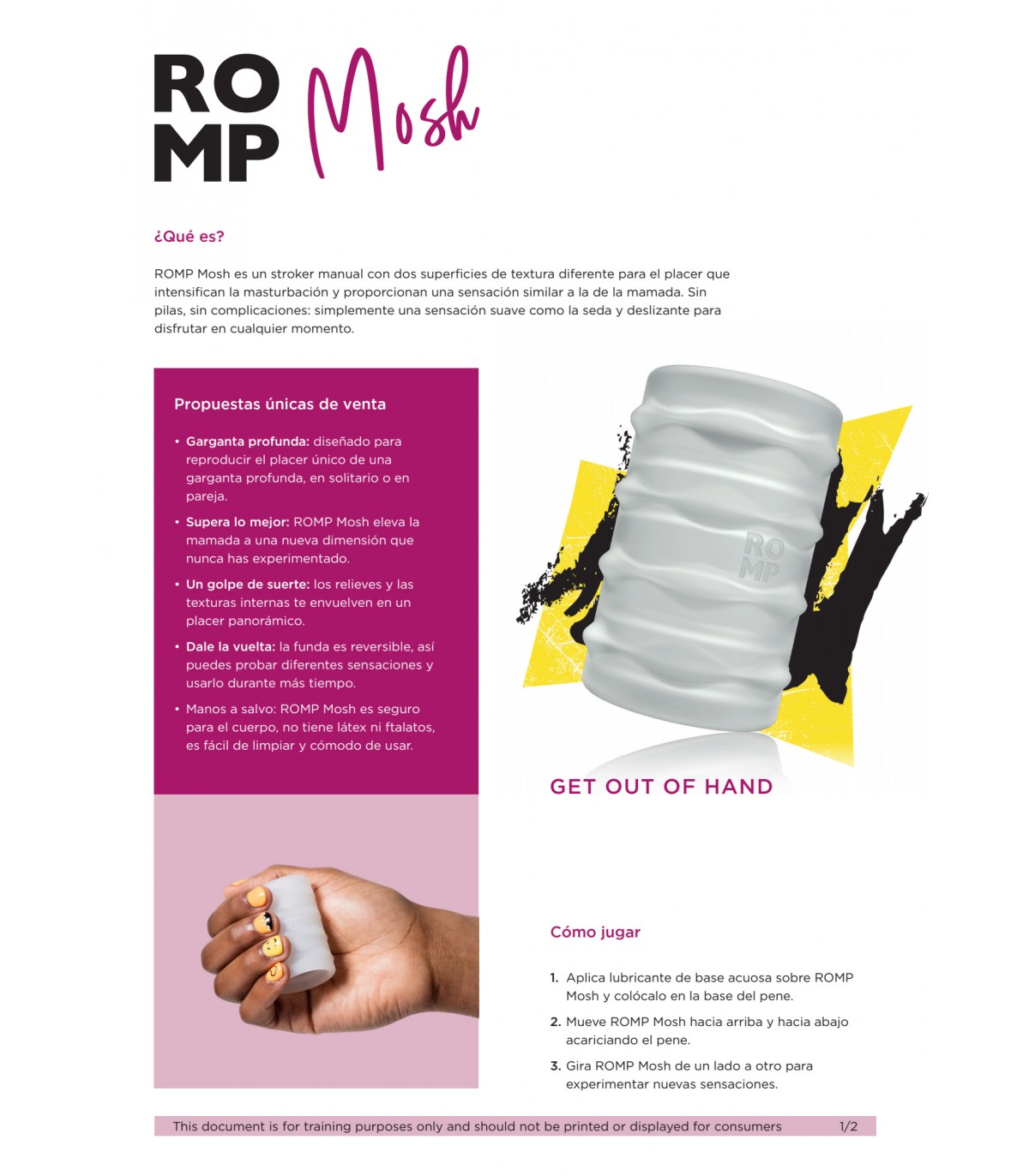 • Manos a salvo: ROMP Mosh es seguro para el cuerpo, no tiene látex ni ftalatos, es fácil de limpiar y cómodo de usar.