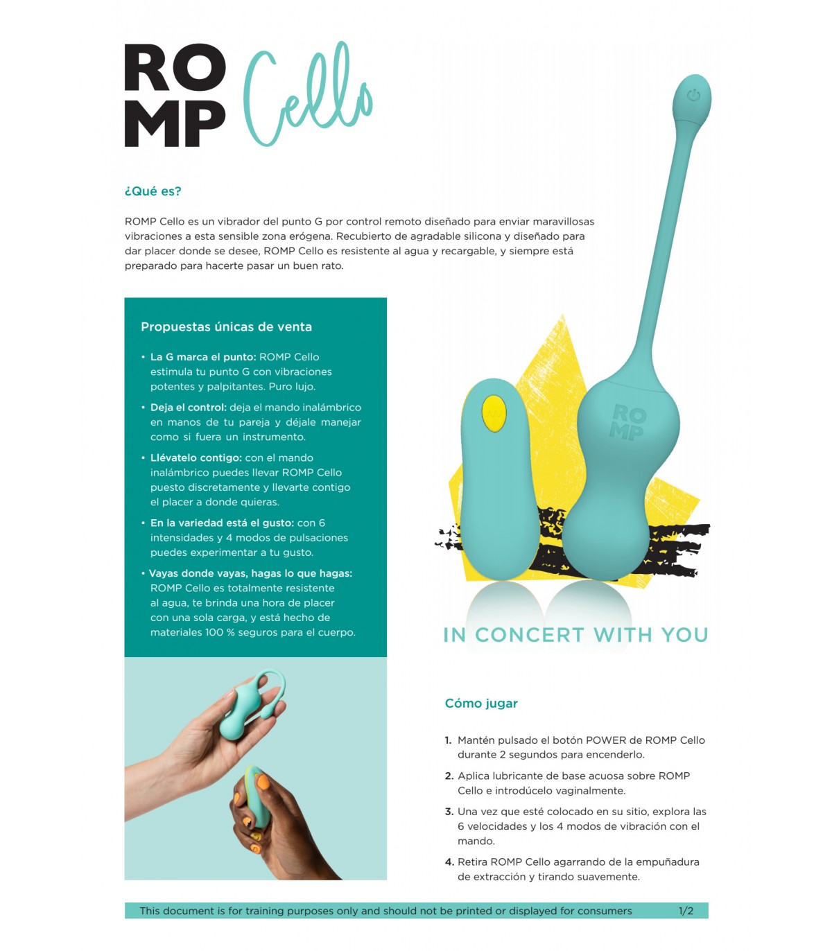 • Vayas donde vayas, hagas lo que hagas: ROMP Cello es totalmente resistente al agua, te brinda una hora de placer con una sola carga, y está hecho de materiales 100 % seguros para el cuerpo