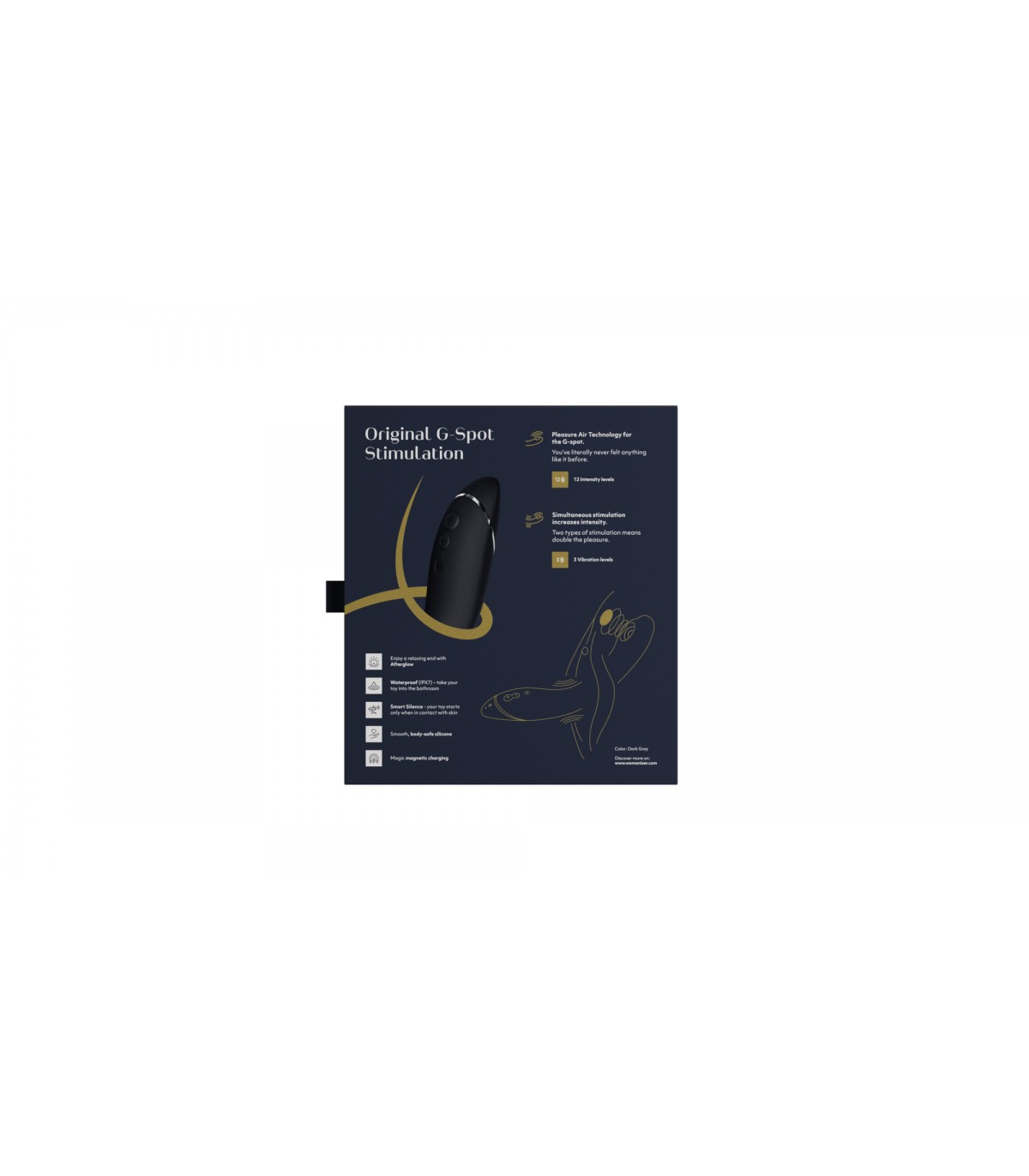 - Pleasure Air para el punto G: La estimulación Pleasure Air incide sobre el punto G con ondas expansivas y una suave succión que provoca un nuevo tipo de orgasmo extraordinario. 12 niveles de intensidad perfectamente equilibrados que ofrecen el ajuste adecuado para cada estado de ánimo.