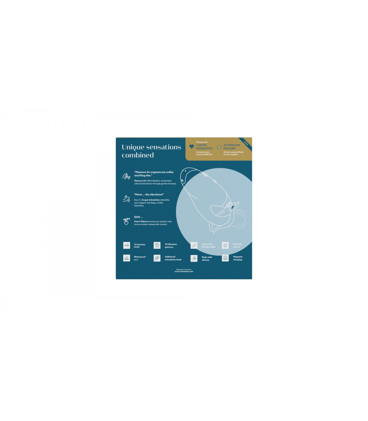 - Pleasure Air Technology: brinda un equilibrio perfecto entre cambios pulsantes y masajeadores de air pressure sin contacto con el clítoris. Esto garantiza que las aproximadamente 8000 terminaciones nerviosas no lleguen nunca a sobreestimularse para proporcionar un nuevo tipo de orgasmo extraordinario.
