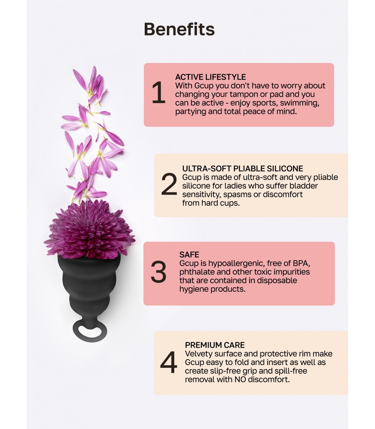 La principal ventaja e innovación de la Gcup es la estructura interna. En el interior del recipiente hay una válvula de retención que evita que se escape el líquido. La copa menstrual Gcup tiene forma de campana, lo que facilita su uso.