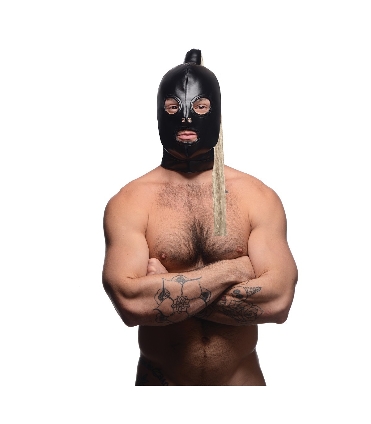 ¡Cumple tus fantasías fetichistas con esta capucha de cuero suave que oculta la cara mientras mantiene los ojos, la nariz y la boca libres! Una peluca rubia larga se adjunta a la parte superior de la capucha para un efecto encantador. Este cabello también se puede usar para juegos de sensaciones de la misma manera que usaría un cosquilleo de plumas.