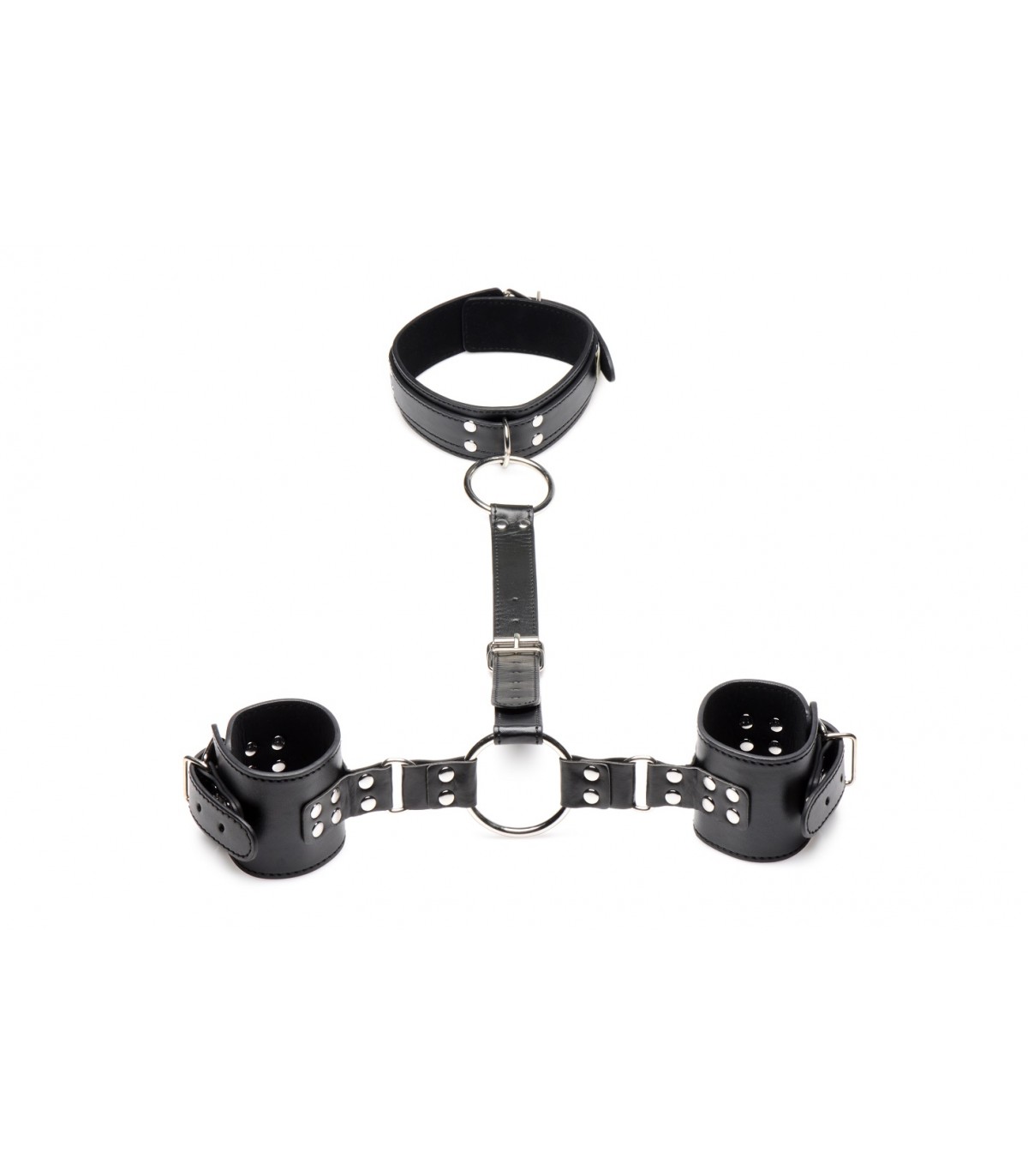 Engancha tus dedos alrededor de las juntas tóricas y tira de tu amante hacia ti. Juega colocando las juntas tóricas en diferentes puntos de anclaje o aleja las manos de ellos. Sus muñecas estarán esposadas y restringidas, la correa central unida a su cuello con collar. Mantenga la correa central corta para mantener sus manos fuera del alcance de sus genitales para que no puedan jugar consigo mismos y disfrutar de las burlas y los juegos con ellos. Limite su movimiento aún más llevando la correa hacia atrás y colocando las muñecas sujetas detrás de la espalda.