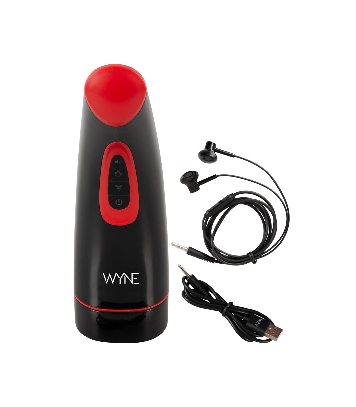 Potente masturbador 03 de WYNE que mima intensamente el pene de forma totalmente automática con 7 modos de vibración y 3 de succión. Además, cuenta con una función de calor de hasta 40 °C y gemidos sensuales (3 sonidos) a través de los auriculares incluidos para que te pongas a tono. Todas las funciones se pueden controlar por separado y cómodamente con sólo pulsar un botón directamente en el práctico juguete.