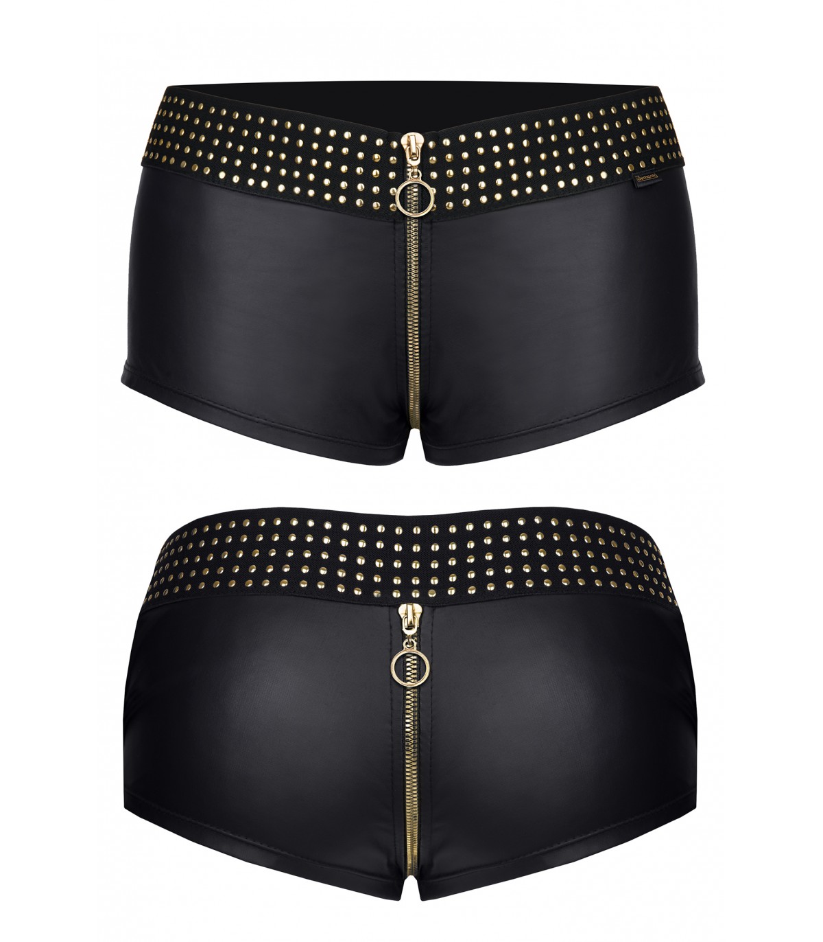 Unos pantalones cortos trepidantemente sensuales con cremallera dorada. Confeccionado en tejido wetlook, muy duradero y elástico. Gracias a estas características, los pantalones cortos se adaptan perfectamente al cuerpo y enfatizan seductoramente su forma. En la parte trasera están perfilados de manera de resaltar la sensualidad y redondez de los glúteos. En la parte superior encontrarás una banda elástica ancha de color negro con adornos decorativos en forma de pequeños puntos dorados. Cremalleras con colgantes decorativos redondos dorados.