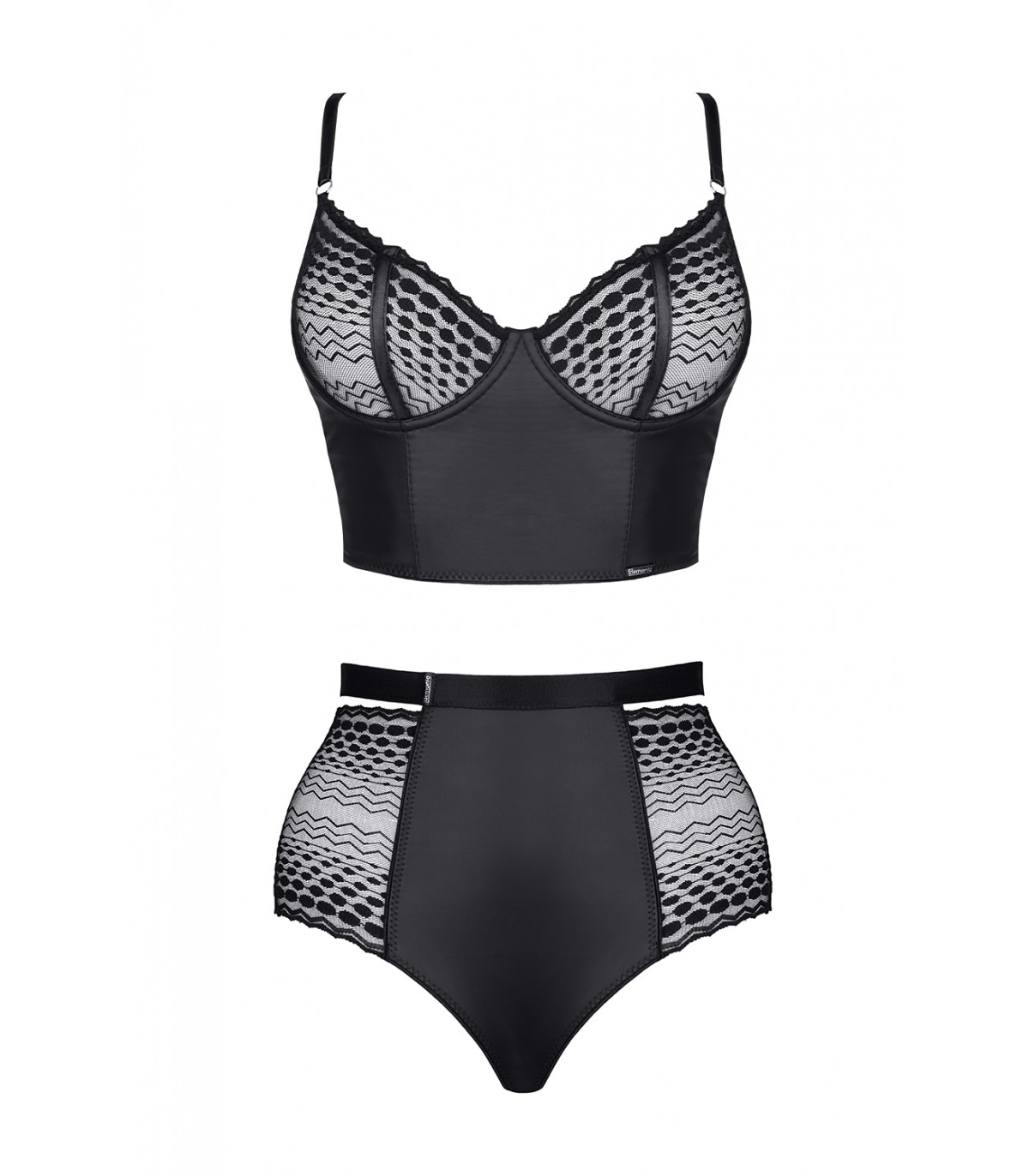 El sujetador seduce gracias a la eficaz combinación de encaje geométrico negro y material mojado mate. Las copas y los laterales del sujetador están especialmente reforzados con aros. Gracias a esta solución, los senos y el escote lucen muy atractivos.