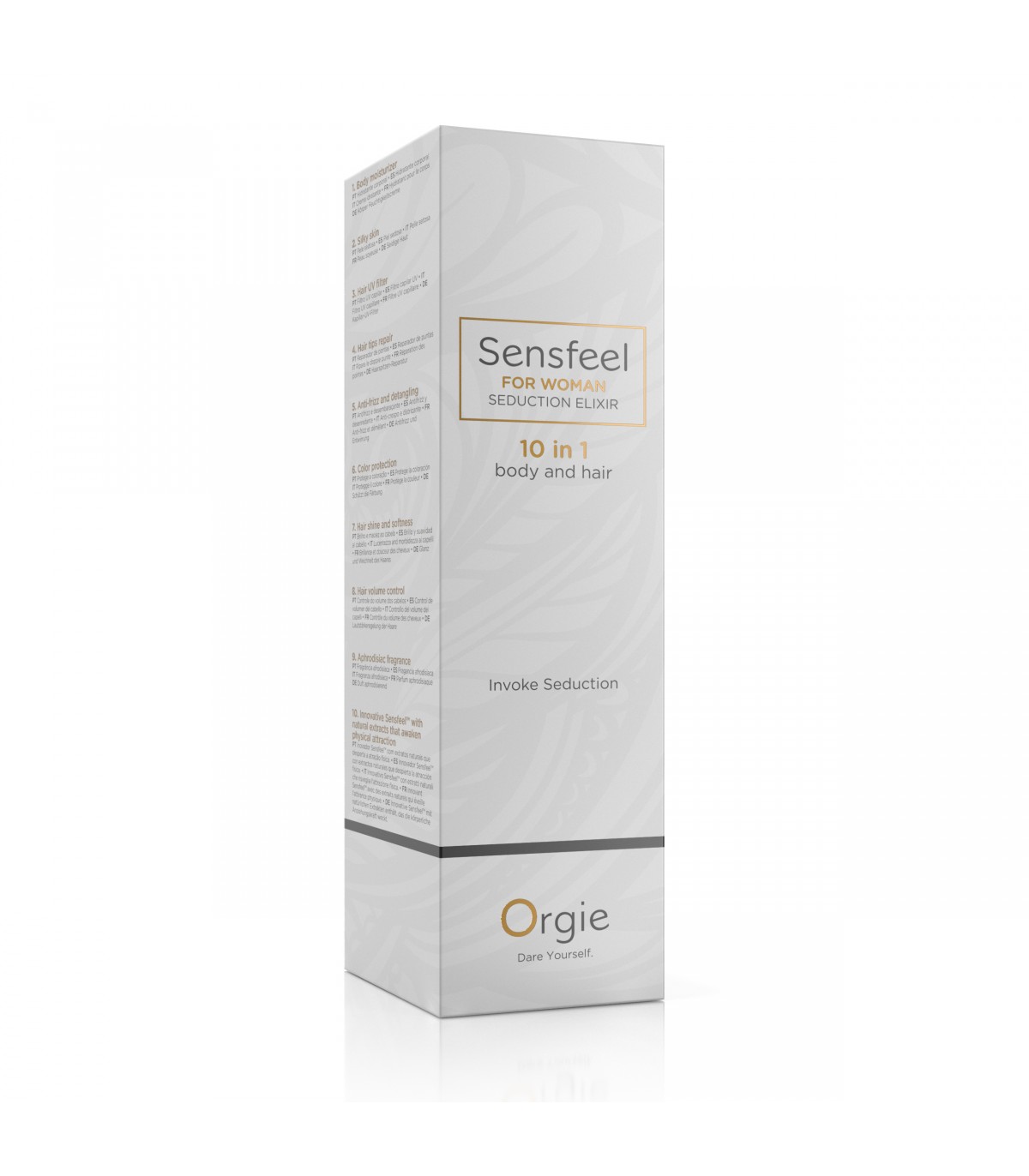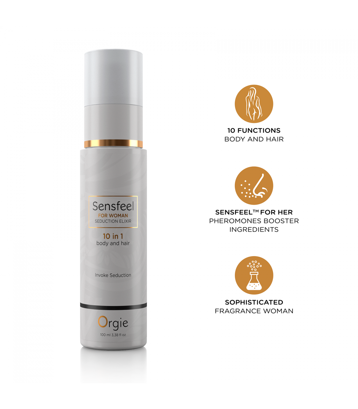Loción de feromonas para el cuerpo y el cabello de formulada con el ingrediente de base natural Sensfeel for Her y una seductora fragancia feminina. Un producto eficaz en todas sus 10 funciones.