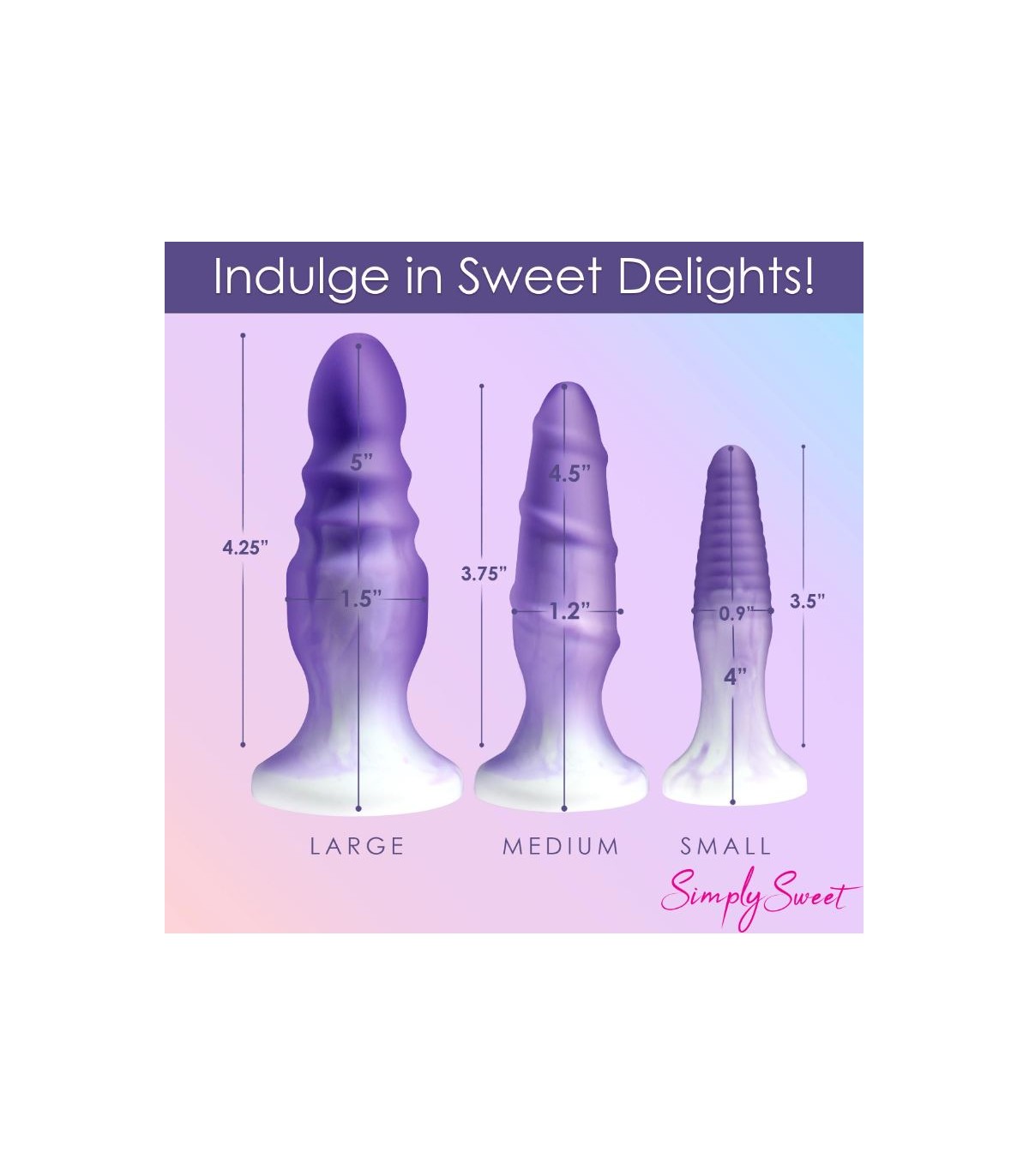 Tres plugs texturizados: desde pequeños, medianos y grandes, ¡estos tres plugs también tienen texturas únicas! El pequeño tiene nervaduras, el mediano tiene un sacacorchos y el grande tiene desniveles llenos de baches. ¡Cada uno realzará tu sensible trasero mientras los deslizas hacia adentro!
