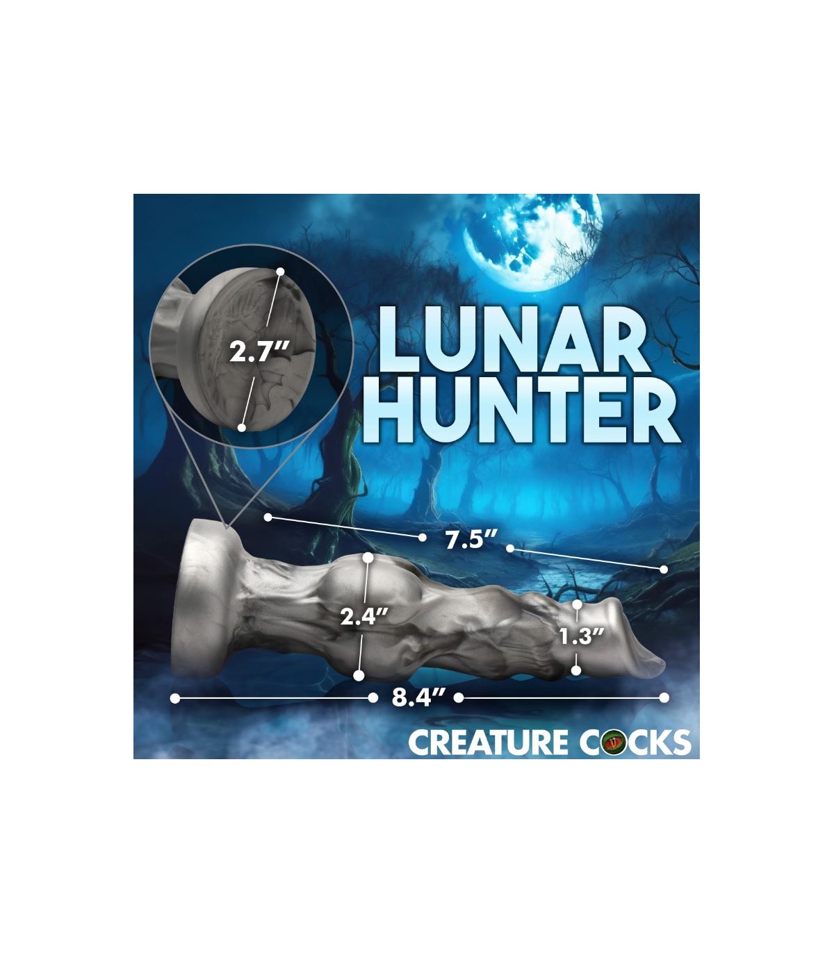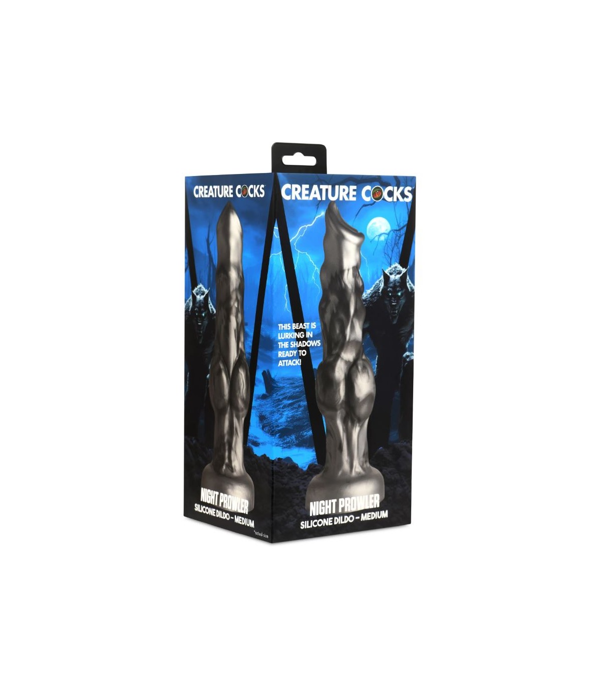 - Consolador de fantasía: plateado y negro ahumado, esta vara de bestia de perro lobo tiene una punta cónica, un eje grueso y 4 nudos abultados sobre la base.