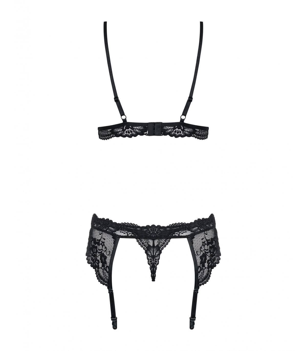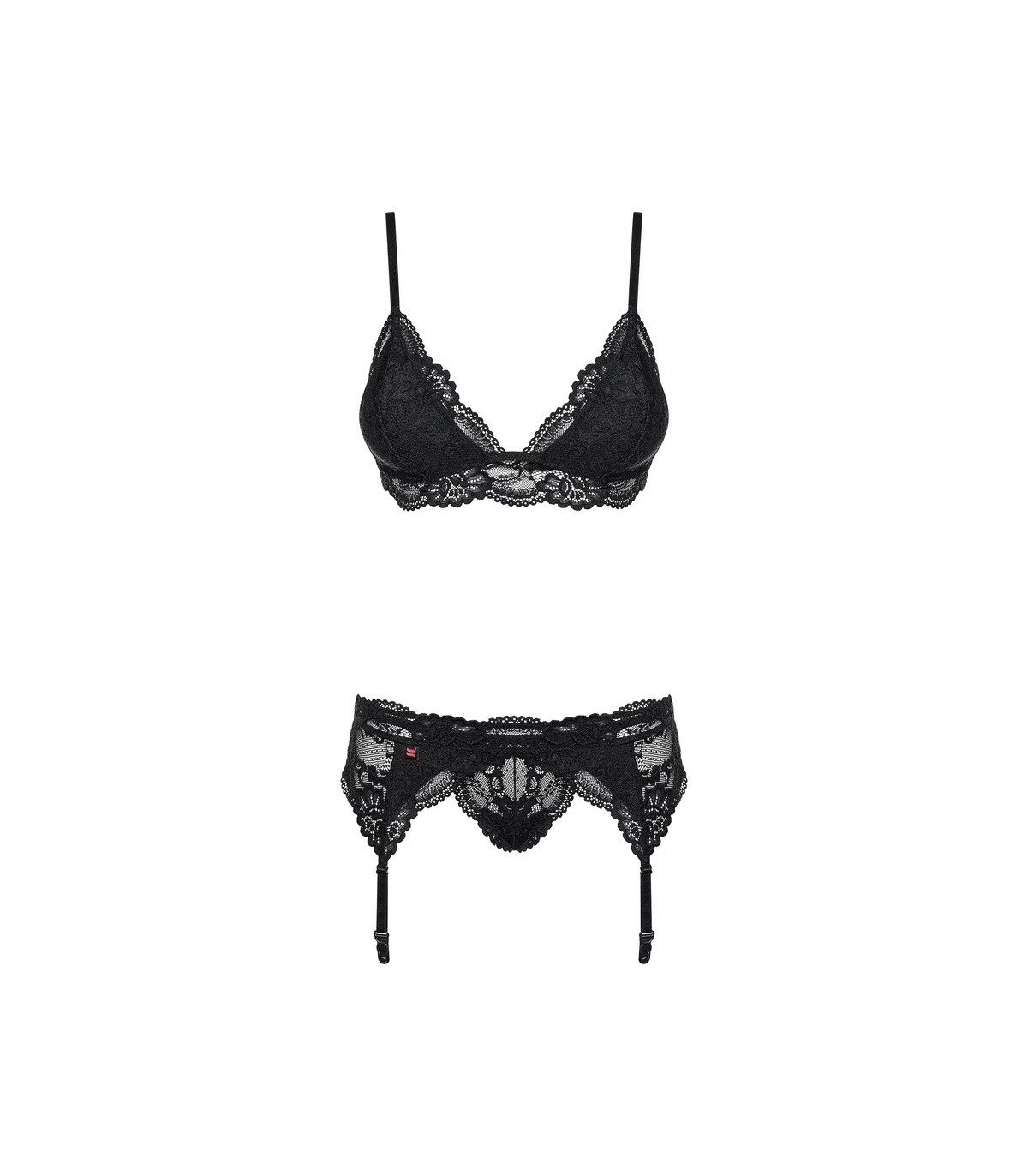 Encaje negro, decoraciones sexys, un corte sensacional que enfatiza la feminidad y una pizca de especias: esto es lo que tienta el conjunto de la colección 810. Las copas triangulares del sujetador resaltan perfectamente el pecho y el tanga clásico garantiza una bella apariencia de las caderas y el trasero. El sensual liguero quedará fantástico con unas medias a juego. Descubra más detalles: