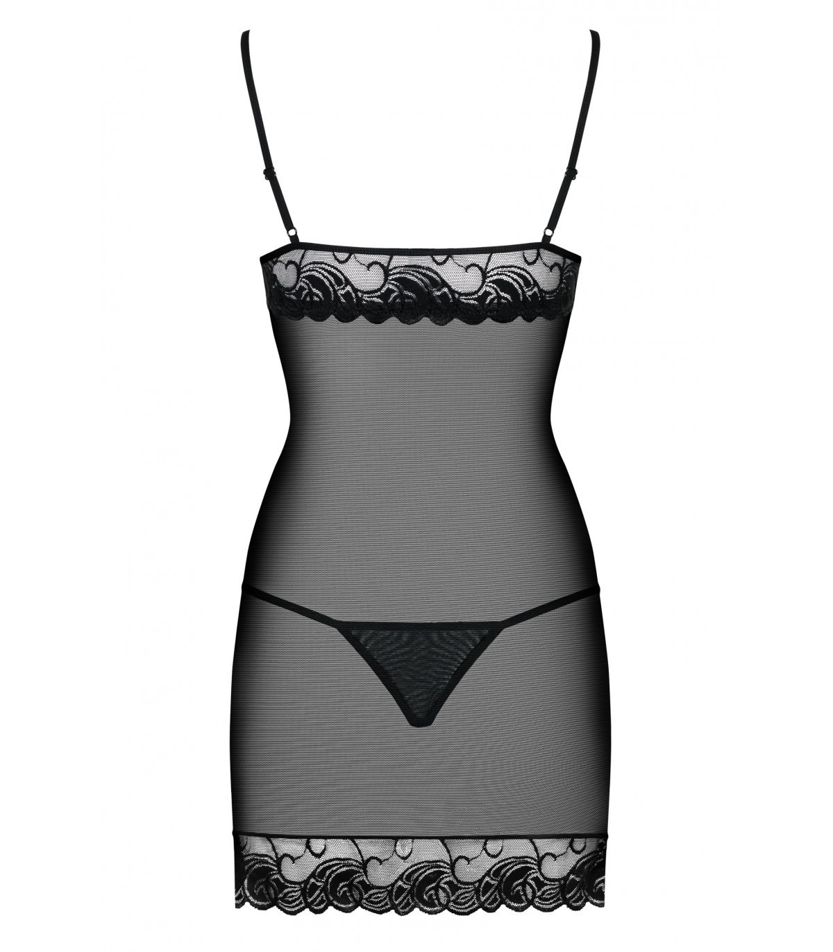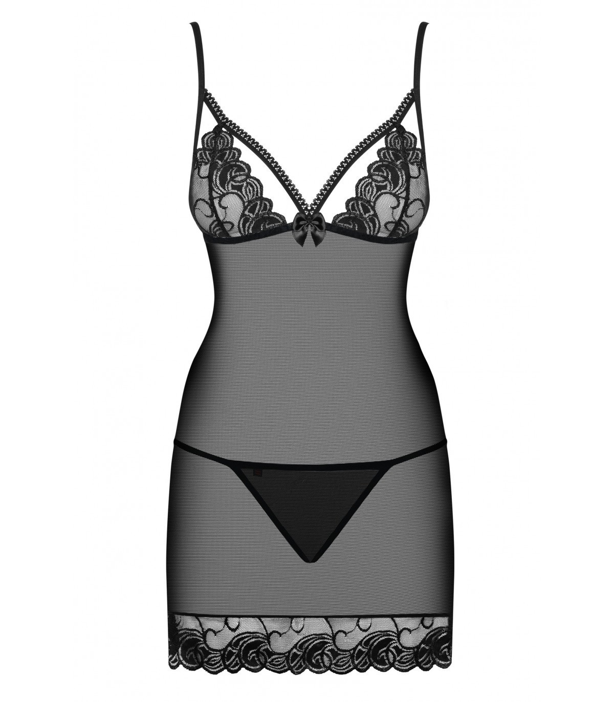 Delicada camisola Wonderia en combinación negra de malla suave y encaje decorativo. lleno de atractivo sexual correas ajustables para un ajuste perfecto copas de forma triangular: busto sutilmente expuesto en el escote, un cinturón elástico y coqueto adornado con un lazo de encaje entre los senos – Detalle elegante en la parte inferior y trasera de la camisola rematada con encaje. añade un encanto femenino a juego con tanga incluida, material elástico agradable al tacto (90% poliamida, 10% elastano)