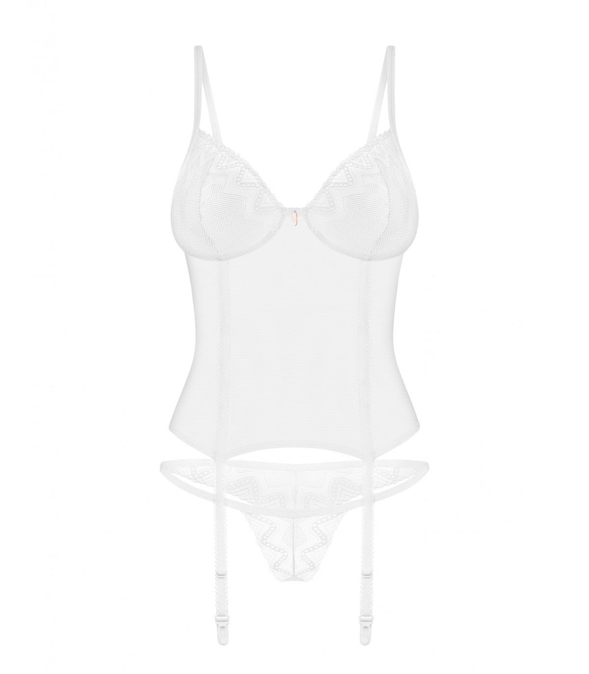 Realza tu look con medias de nuestra colección, perfectamente coordinadas con este conjunto de tanga y corsé blanco.