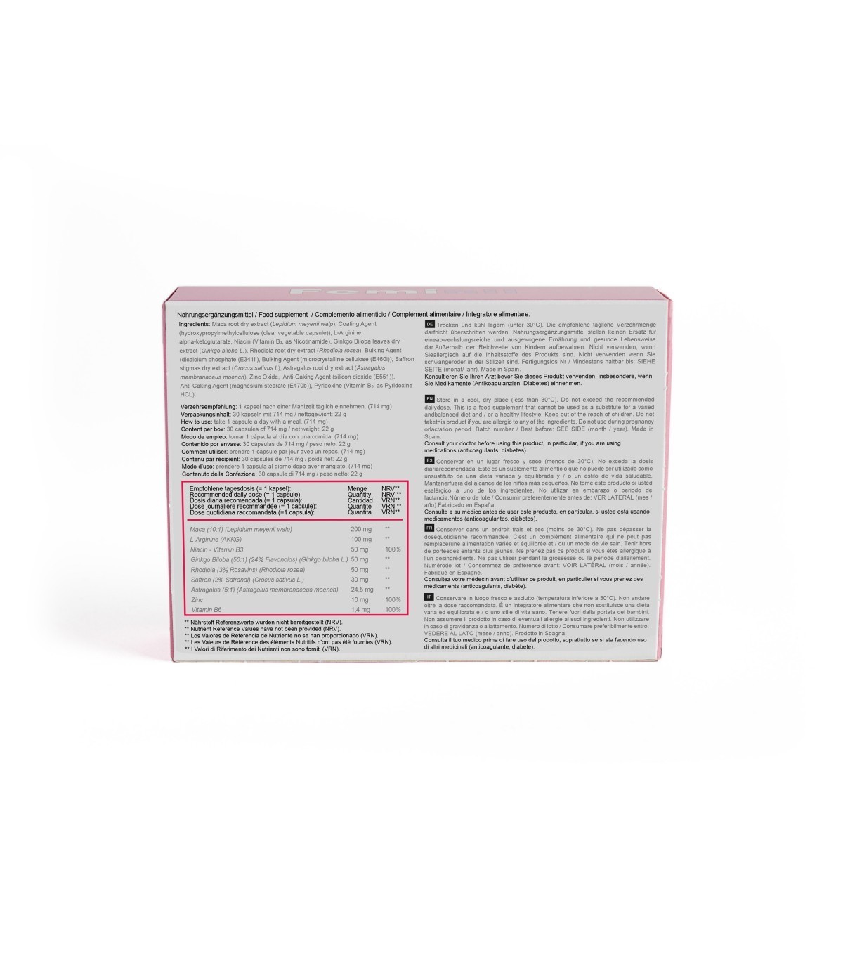 Ingredientes: Maca, L-Arginina, Azafrán, Rhodiola, Ginkgo Biloba,Zinc