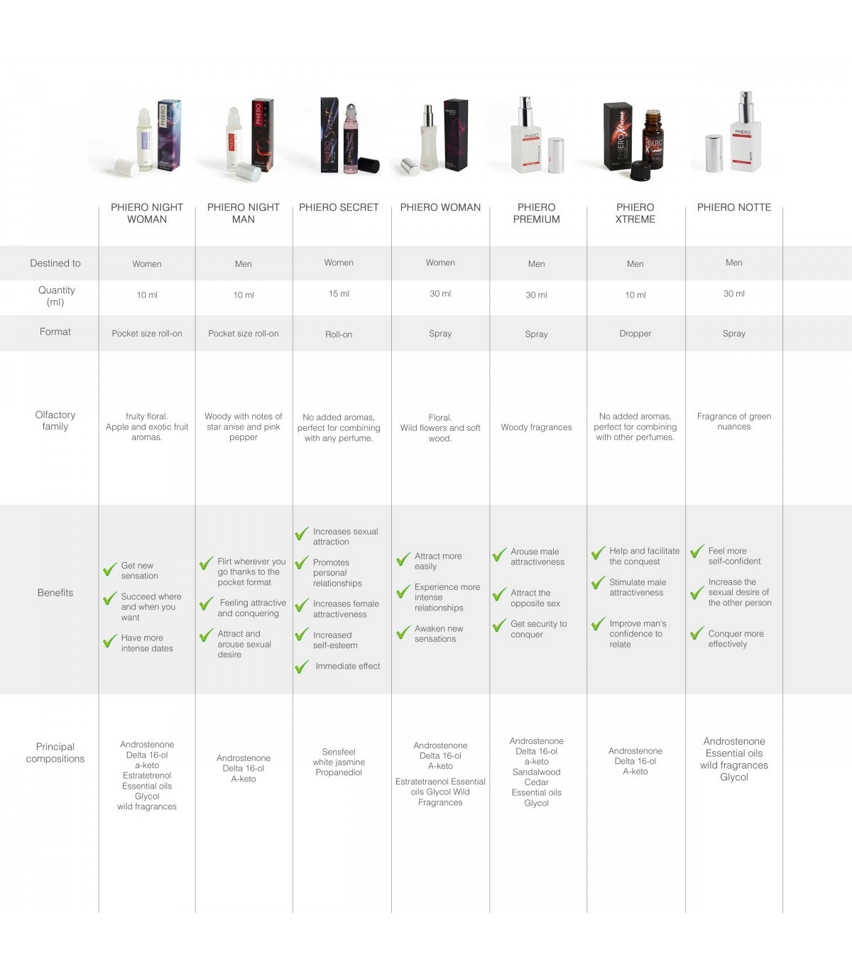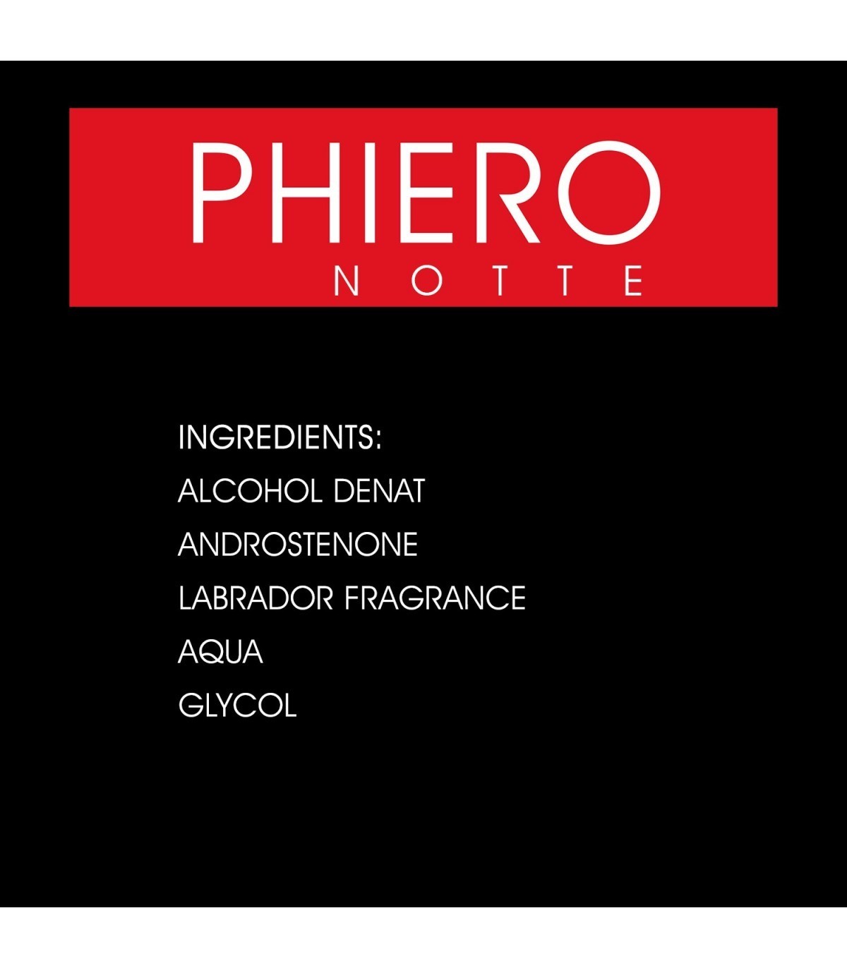 Phiero Notte posee un aroma suave y embriagador con toques silvestres y matices verdes que se mantiene durante horas y que permitirá dar seguridad en cualquier situación. Phiero Notte contiene feromonas que quedan impregnadas en el cuerpo durante 8-10 horas. Phiero Notte funciona tanto para atraer mujeres como hombres ya que la respuesta cerebral actúa al momento con todas las personas que se sientan atraídas por la producción de feromonas masculinas, produciéndose una mayor atracción.