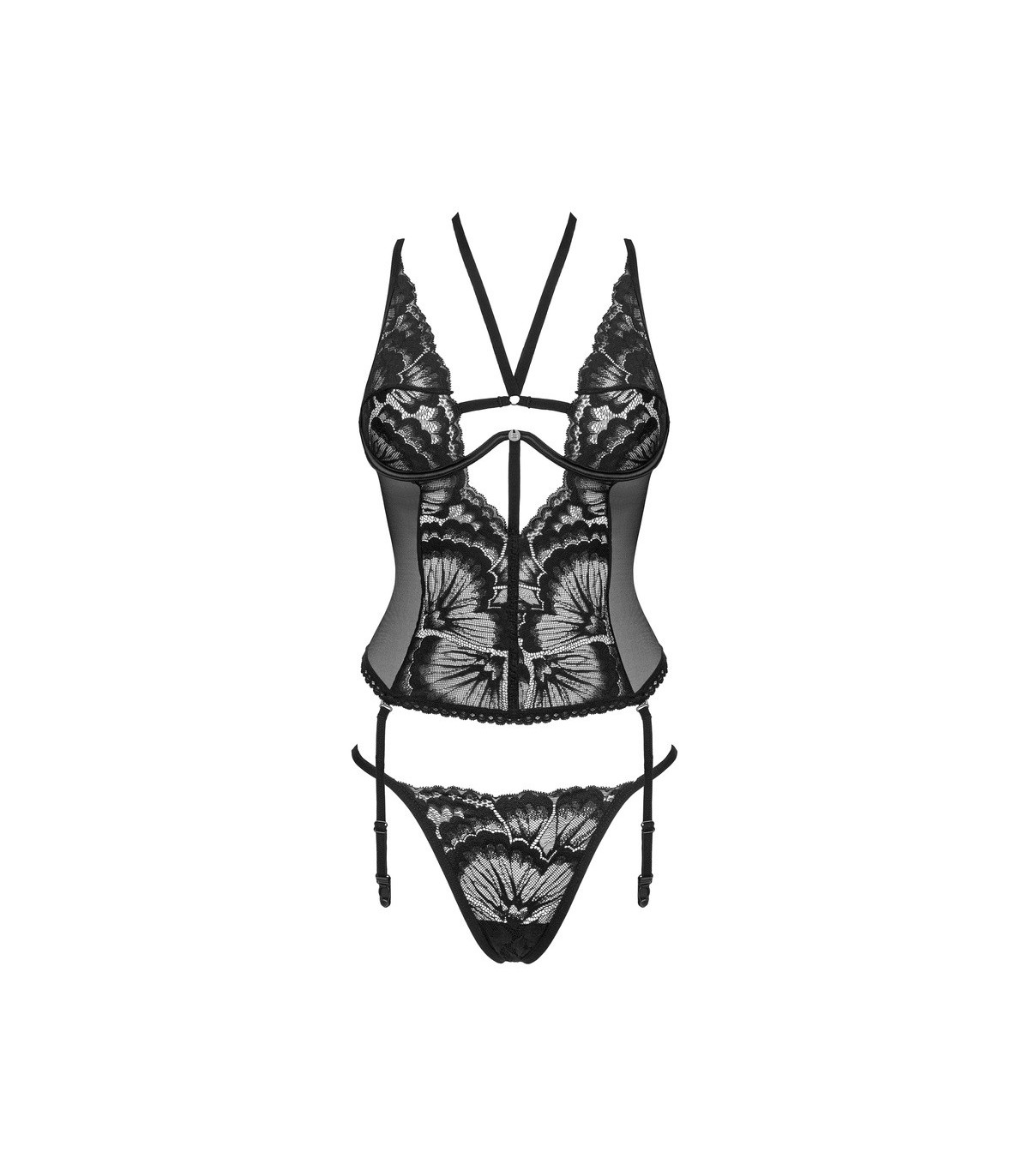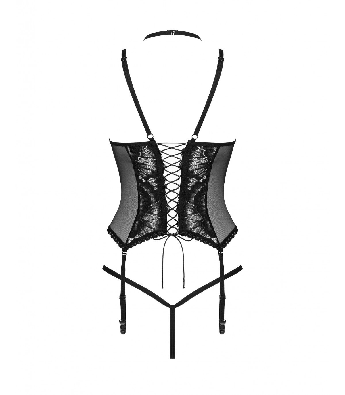 Sexy corsé negro con elementos de encaje en un patrón floral. Una propuesta muy elegante en línea con las últimas tendencias de la moda. El escote decorado con tirantes sexys ciertamente llama la atención, pero también tienta e intriga. La malla ligeramente translúcida en el Los laterales realzan maravillosamente la figura y el cordón ajustable garantiza comodidad y aporta carácter a todo el conjunto. Combínalo con medias a juego y crearás una estilización llena de sex-appeal.