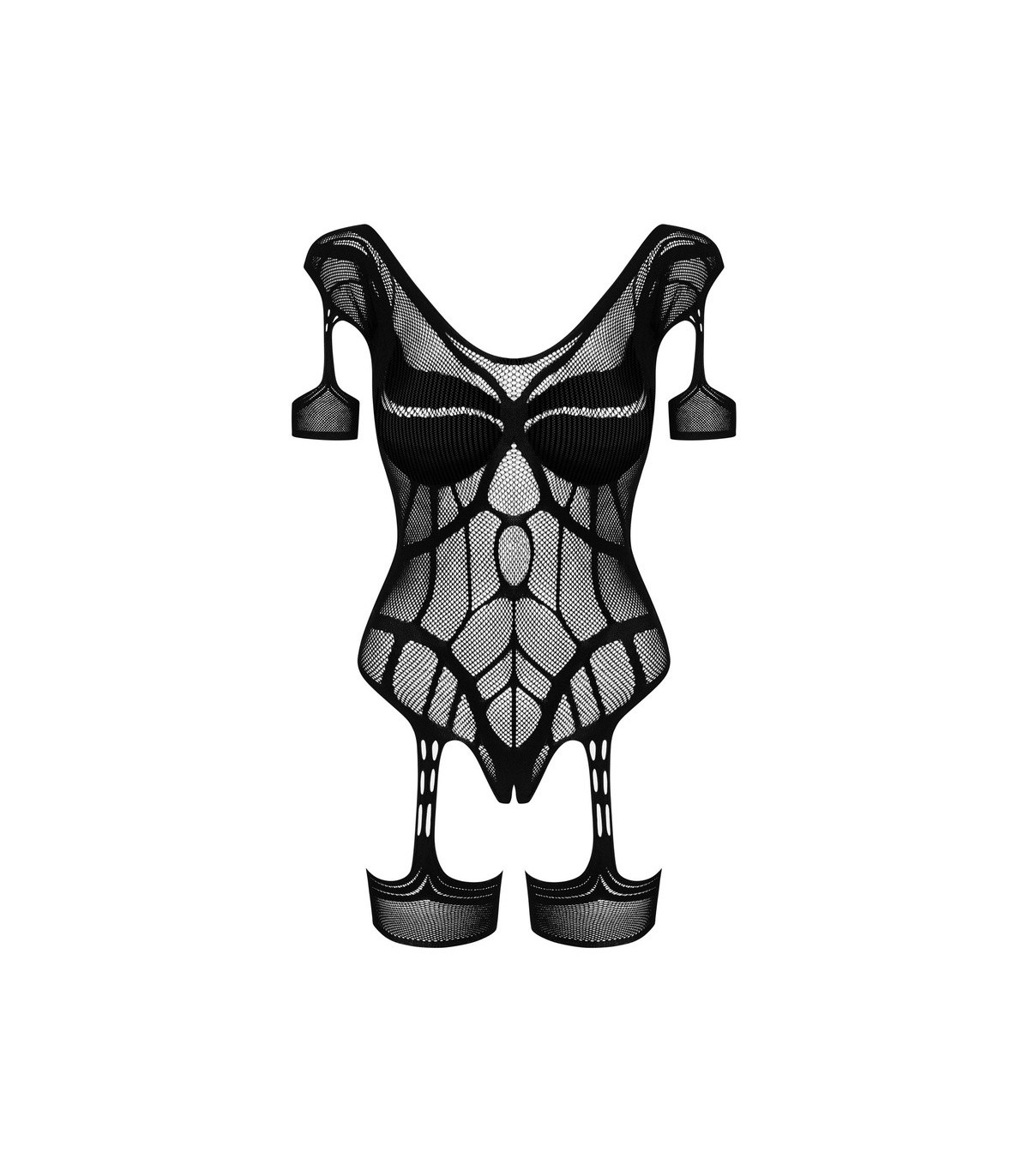 Aquí tienes un diseño muy seductor para mujeres atrevidas que anhelan sensaciones nuevas y estimulantes. ¡La combinación de un bodystocking abierto con ligas elásticas seguramente aumentará el calor en tu dormitorio! Mangas cortas a juego con las ligas, una delicada malla que envuelve el cuerpo, un patrón geométrico que atrae toda la atención hacia los senos y un corte profundo y pronunciado en la espalda: ¿qué más se puede pedir?
