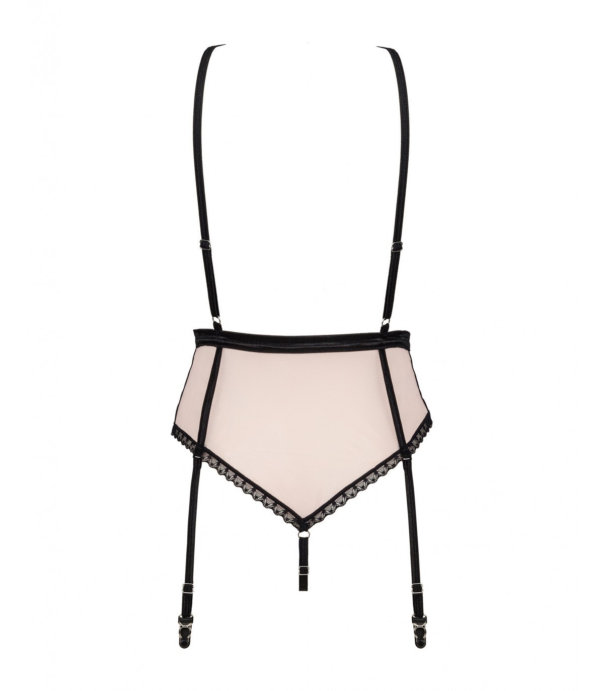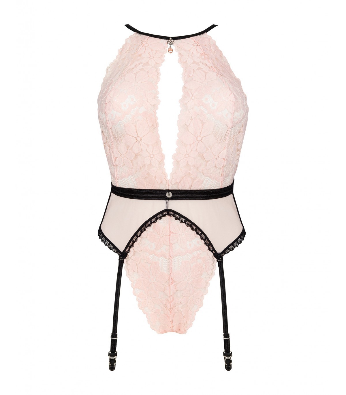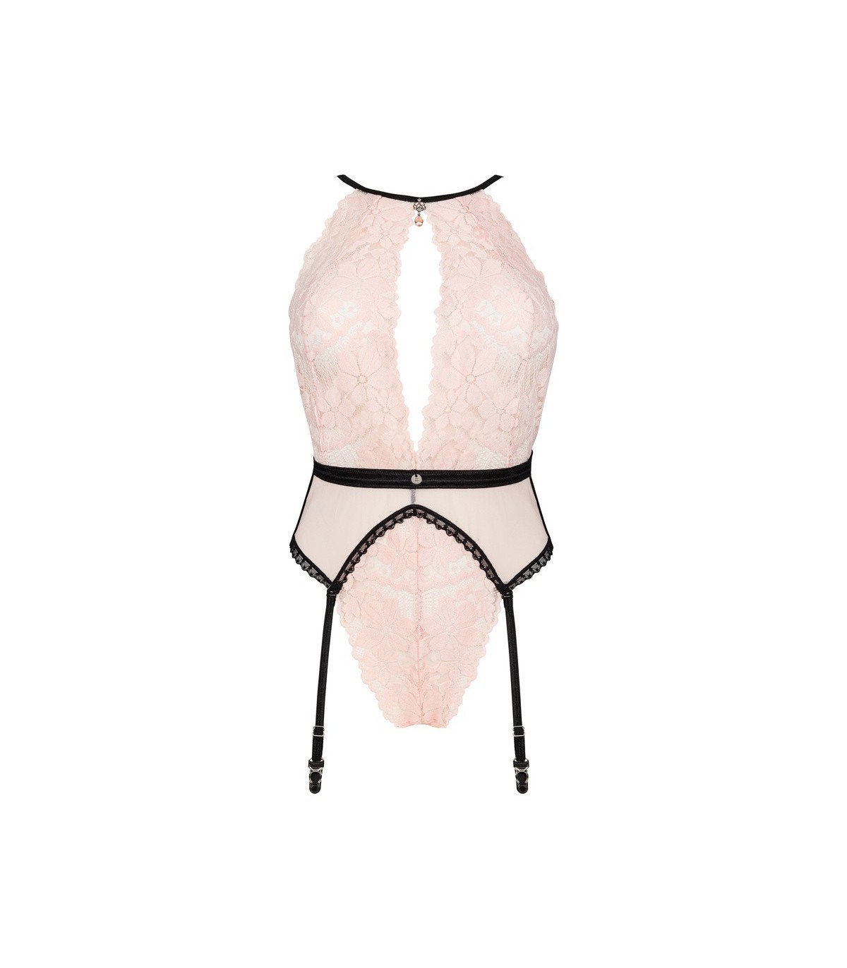 Osito de encaje en combinación con un liguero a juego. El encaje rosa pálido y las inserciones de tela negra en contraste enfatizan las formas femeninas. El delicado patrón floral agregará elegancia, y el escote profundo y la espalda expuesta asegurarán una apariencia sexy. Colgantes de joyería en el cuello y el estómago será un accesorio elegante. Los tirantes de liga desmontables te permitirán usar el osito de dos maneras.