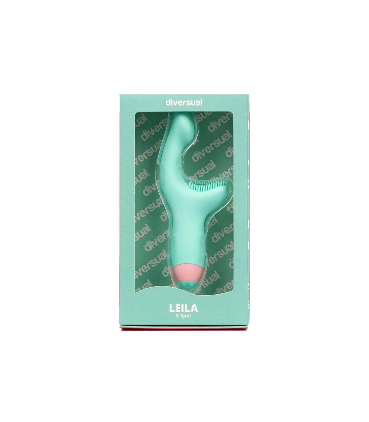 El brazo curvo de Leila con su engrosamiento en la punta está diseñado para localizar la zona G con facilidad, mientras toda la vulva está en contacto con su suave silicona. Este producto se vende en diversual.com.