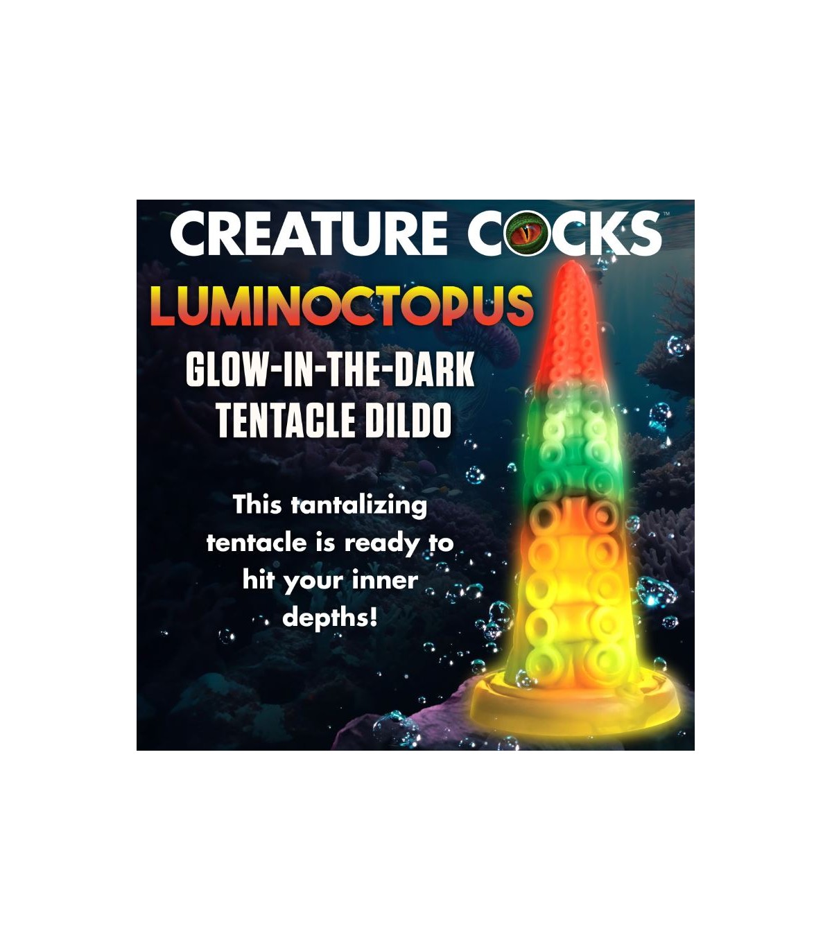 Consolador luminoso de fantasía: este tentáculo tiene una punta cónica, filas de ventosas, textura similar a la de una lengua y brilla en la oscuridad. Es un sorbete de colores del arcoíris durante el día y brilla de color rojo, verde y amarillo en la oscuridad.