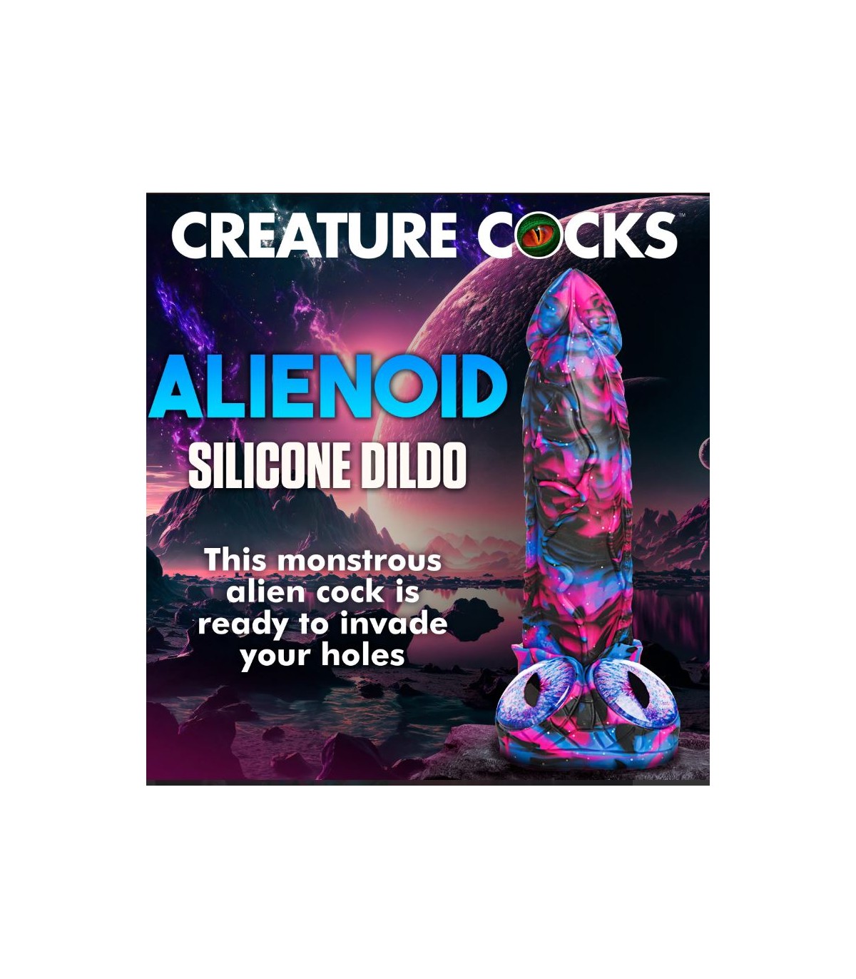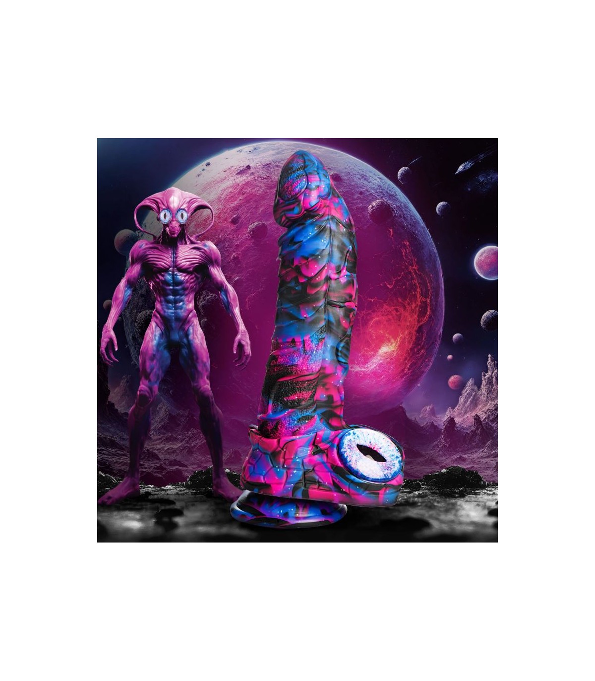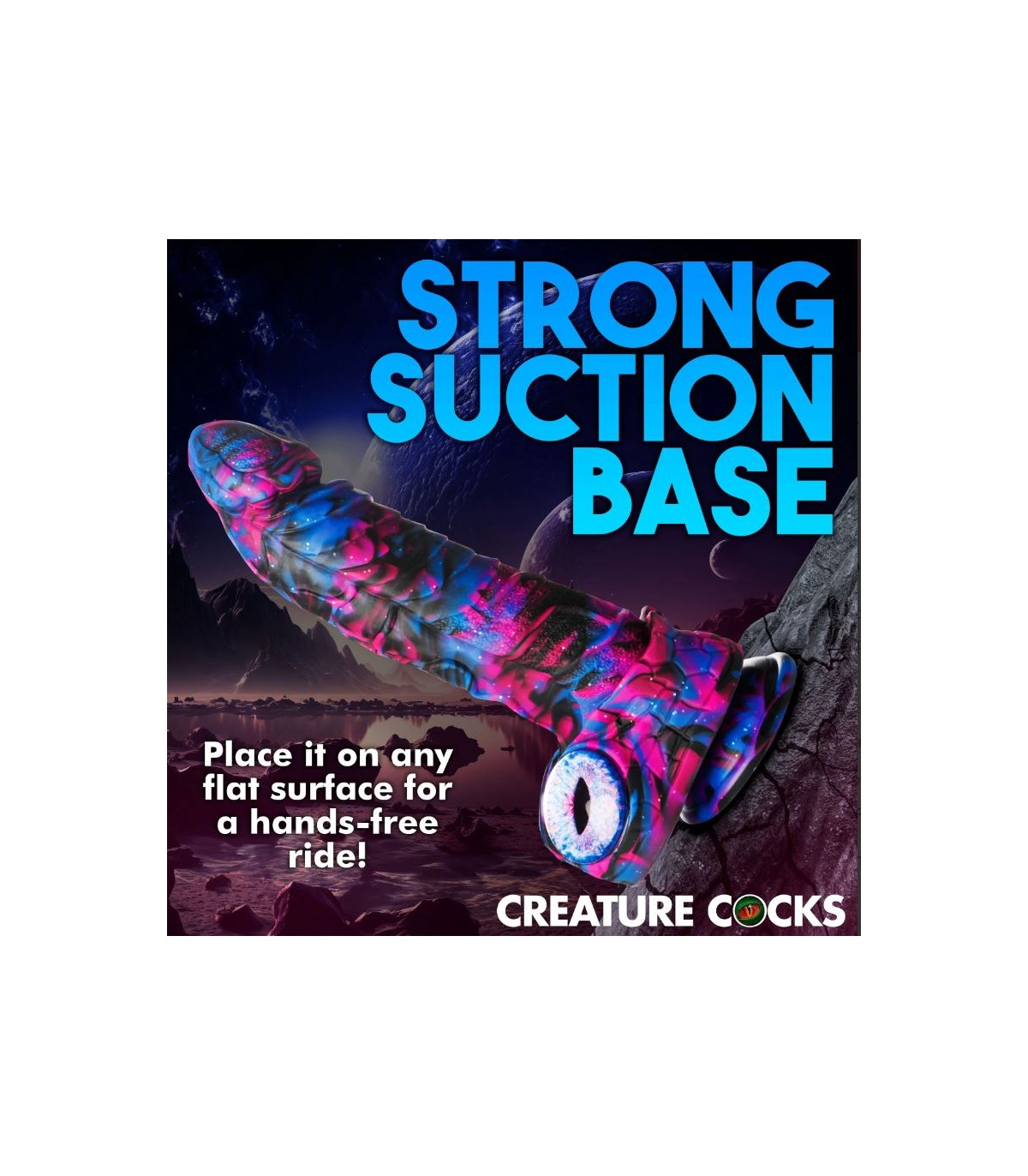 Consolador de fantasía: ¡Esta vara alienígena cósmica se coloca directamente sobre su cara! ¡Disfruta de la textura única a lo largo del eje grueso, la punta puntiaguda, los colores galácticos y los ojos grandes y felinos!