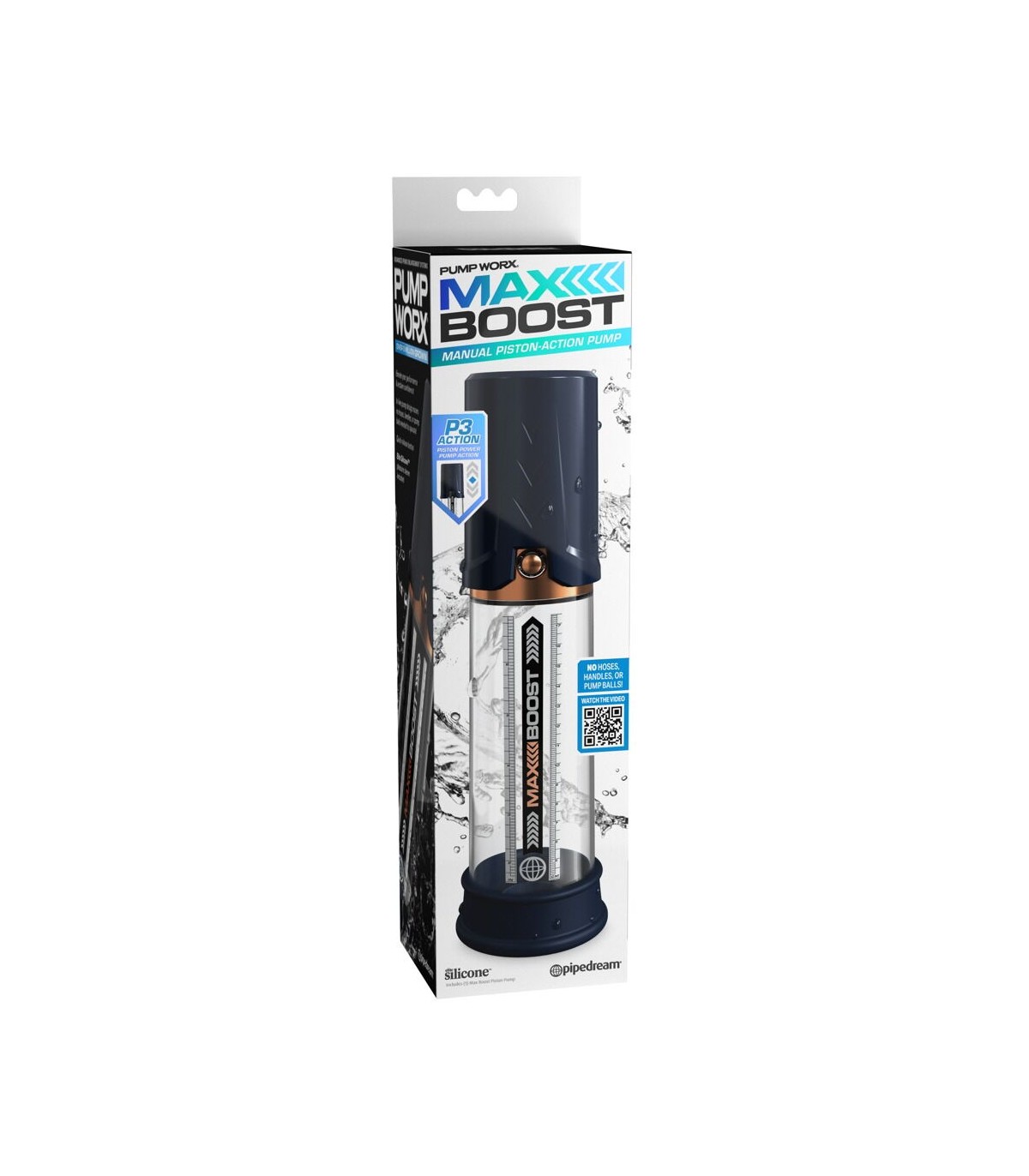• DISEÑO EXCLUSIVO DE ACCIÓN MANUAL CON PISTÓN: El diseño sin motor hace que el Max Boost sea perfecto para usar en el baño o la ducha. Para una experiencia más intensa, intente llenar el tubo con agua antes de bombear.