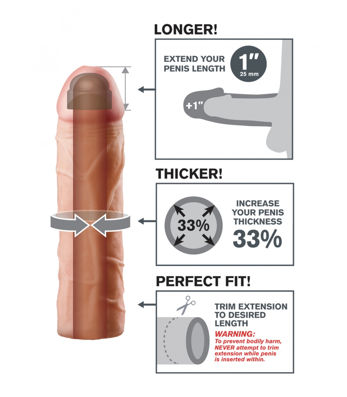 La extensión Perfect de 1 pulgada es una extensión personalizable que se puede recortar fácilmente en la base para un ajuste perfecto. Es súper elástica para adaptarse a la mayoría de los tamaños y lo suficientemente cómoda para ayudarte a durar más. Tu pareja disfrutará de una penetración más profunda con la extensión de 1 pulgada en la punta, mientras que el eje ultra realista te hace un 33 % más grueso para ofrecer una sensación más completa y un clímax excepcional. El material Fanta Flesh® súper suave se siente como una segunda piel. Perfecto para hombres con disfunción eréctil y problemas de rendimiento intermedio.