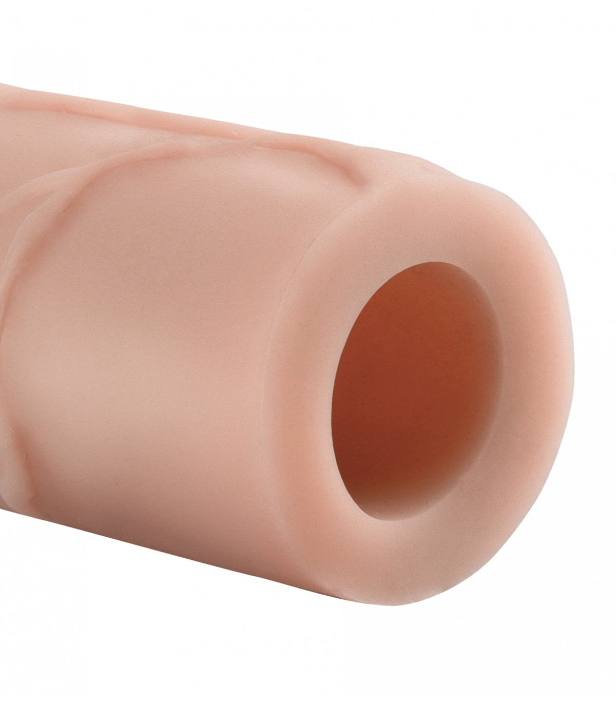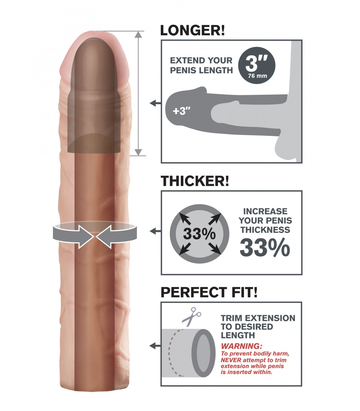 La extensión Perfect 3" es una extensión personalizable que se puede recortar fácilmente en la base para un ajuste perfecto. Es súper elástica para adaptarse a la mayoría de los tamaños y lo suficientemente cómoda para ayudarte a durar más. Tu pareja disfrutará de una penetración más profunda con la extensión de 3" en la punta, mientras que el eje ultra realista te hace un 33 % más grueso en todos los sentidos. El material suave Fanta Flesh® se siente como una segunda piel, lo que te brinda la longitud, el grosor y la confianza que necesitas para satisfacer a tu amante.
