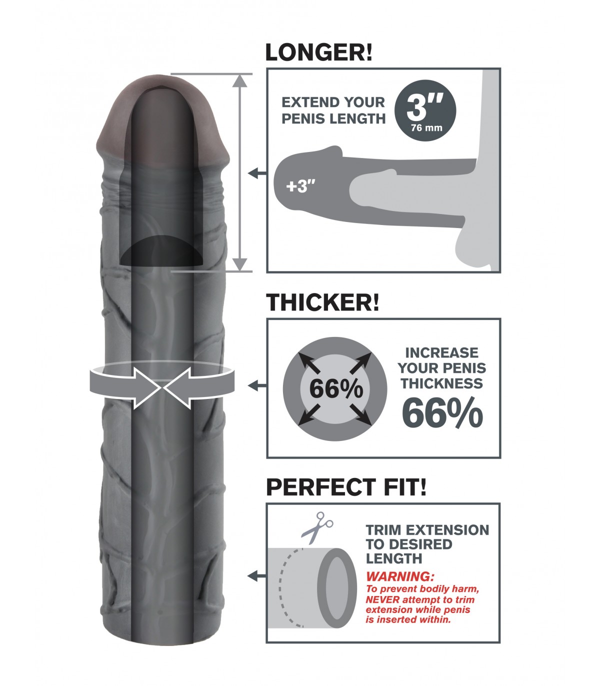 La Mega 3" Extension es una extensión personalizable que se puede recortar fácilmente en la base para un ajuste perfecto. Es súper elástica para adaptarse a la mayoría de los tamaños y lo suficientemente cómoda para ayudarte a durar más. Tu pareja disfrutará de una penetración más profunda con la extensión de 3" en la punta, mientras que el eje ultra realista te hace un 66 % más grueso en todos los sentidos. El suave material Fanta Flesh® se siente como una segunda piel, lo que te brinda la longitud, el grosor y la confianza que necesitas para satisfacer a tu amante.