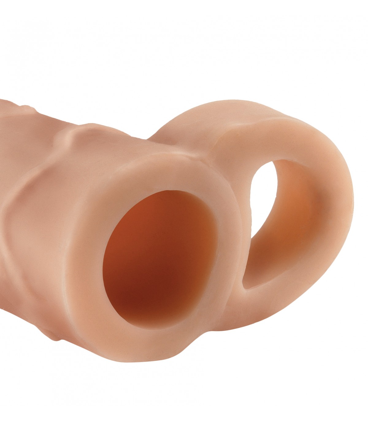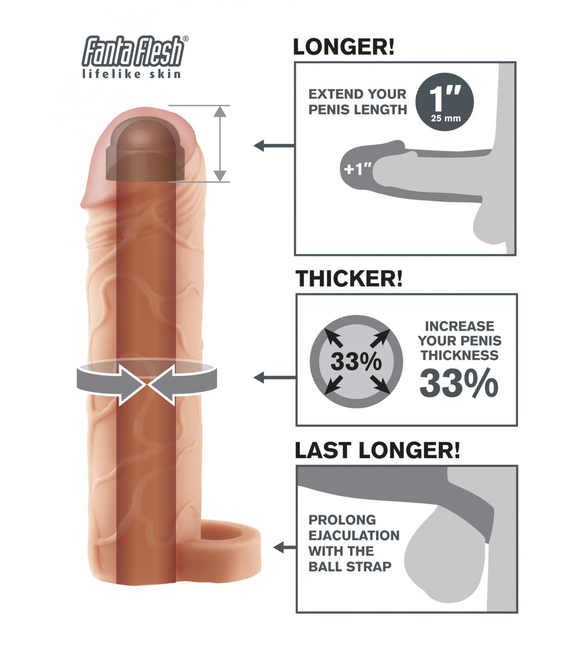 Intensifica el placer para ambos con la extensión perfecta de 1" con correa para testículos . Con la correa para testículos envuelta cómodamente alrededor de ti, prolongarás la eyaculación para el clímax más explosivo que hayas imaginado. Tu pareja disfrutará de una penetración más profunda con la extensión de 1" en la punta, mientras que el eje ultra realista te hace un 33 % más grueso para ofrecer una sensación más completa y un clímax excepcional. Es súper elástico para adaptarse a la mayoría de los tamaños, es lo suficientemente ajustado para ayudarte a durar más tiempo y el material Fanta Flesh® súper suave se siente como una segunda piel, ¡solo que mejor!
