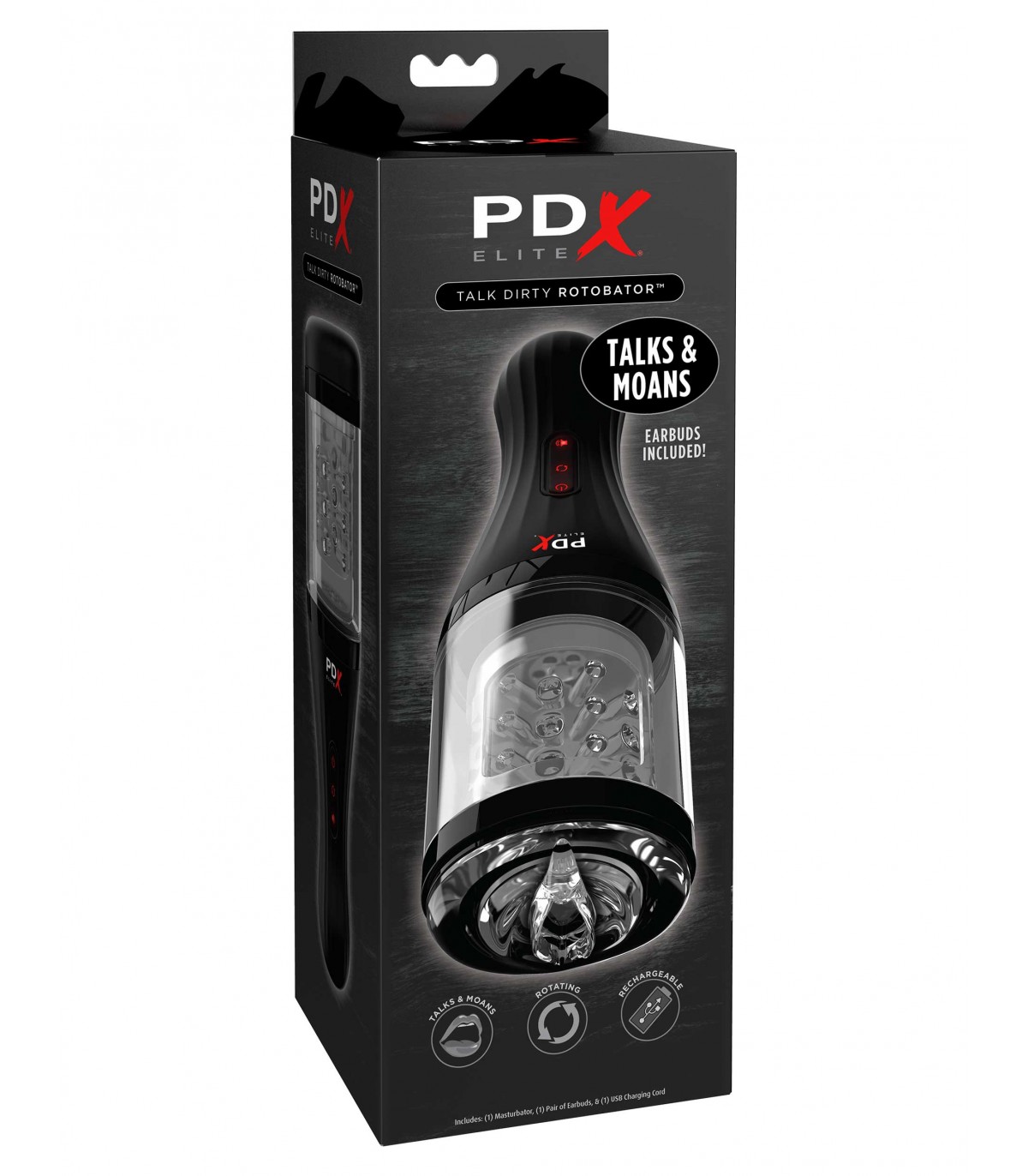 ¡Experimente la verdadera innovación en la masturbación! El PDX ELITE® Talk Dirty Rotobator ofrece una conversación sexy, gemidos entrecortados y una rotación estimulante única, todo en un diseño compacto. Agregar el elemento de sonidos seductores agrega un placer intenso a cada sesión de masturbación, y el conveniente conector para auriculares le permite escuchar en privado. El Talk Dirty Rotobator cuenta con un mecanismo de rotación avanzado que envuelve las áreas sensibles de su eje superior. La abertura flexible se ajusta perfectamente y, con cada revolución automatizada, los pequeños cosquilleadores de la funda de TPR súper suave provocan, complacen y giran con solo presionar un botón. El diseño portátil es perfecto para viajar y guardarlo.