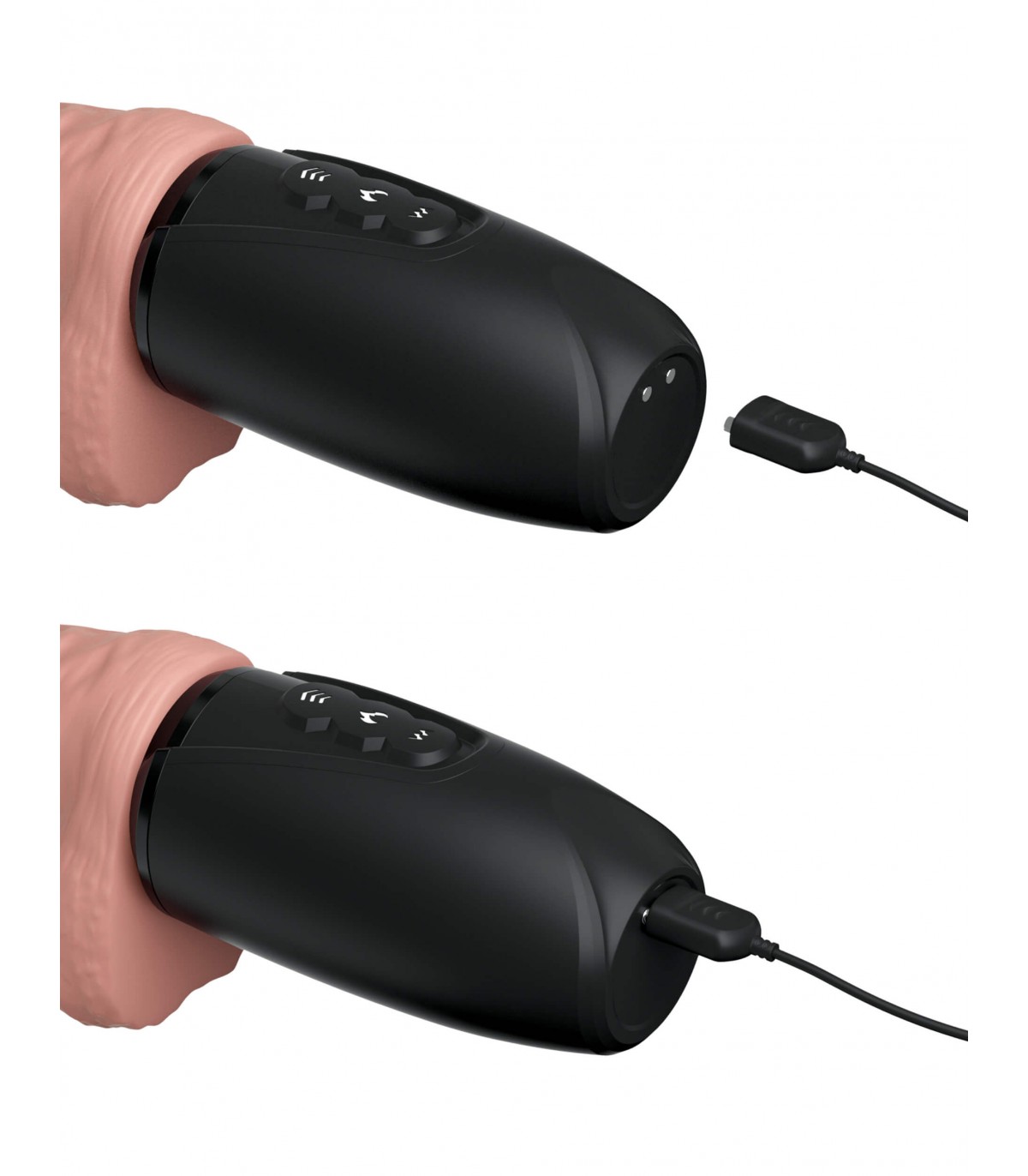 El pene con testículos King Cock® Plus Thrusting Cock es una verdadera amenaza triple que cuenta con un movimiento de empuje impulsado por un pistón de 1 pulgada de profundidad, calentamiento interno a la temperatura corporal en minutos y vibraciones estimulantes poderosas para la mejor experiencia. El placer de empuje está diseñado para responder de forma natural, masajeando cada uno de tus movimientos, rápidos o lentos.