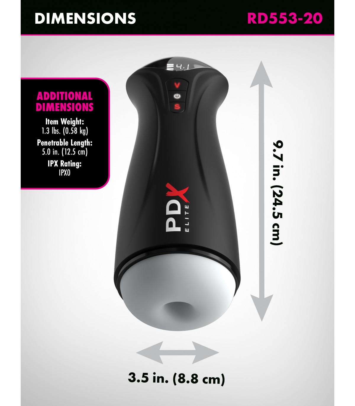 El PDX ELITE Fap-Gasm eleva la masturbación con una potente succión intermitente y vibración para la mejor experiencia de masturbación. ¡Es una tormenta perfecta de sensaciones para sesiones de sexo en solitario intensificadas que se pueden personalizar según tu estado de ánimo personal! Prepárate para un placer explosivo con manos libres mientras la tecnología de succión intermitente succiona automáticamente tu pene hacia adentro y hacia afuera. ¡Diseñado para el máximo placer, las paredes texturizadas de la funda ultra suave no se parecen a nada que hayas sentido antes! ¡El Fap-Gasm está listo cuando tú lo estás y te brindará los orgasmos más intensos que hayas tenido!